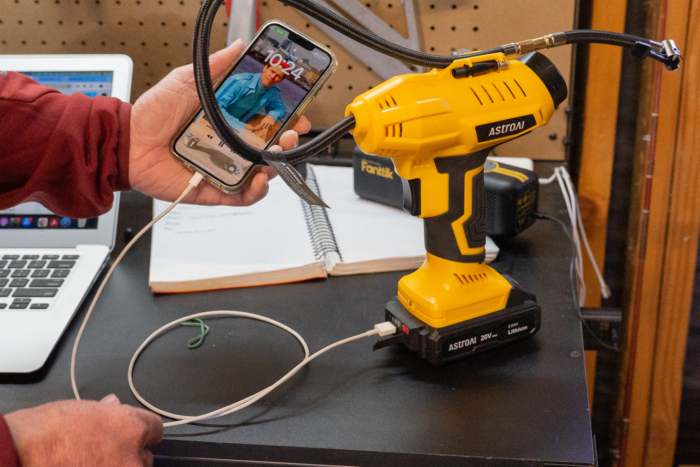 Most of the testing happens in a controlled environment (the garage) where we can compare inflation times side by side with a stopwatch, measure hose lengths, and access different-sized tires on different vehicles.
