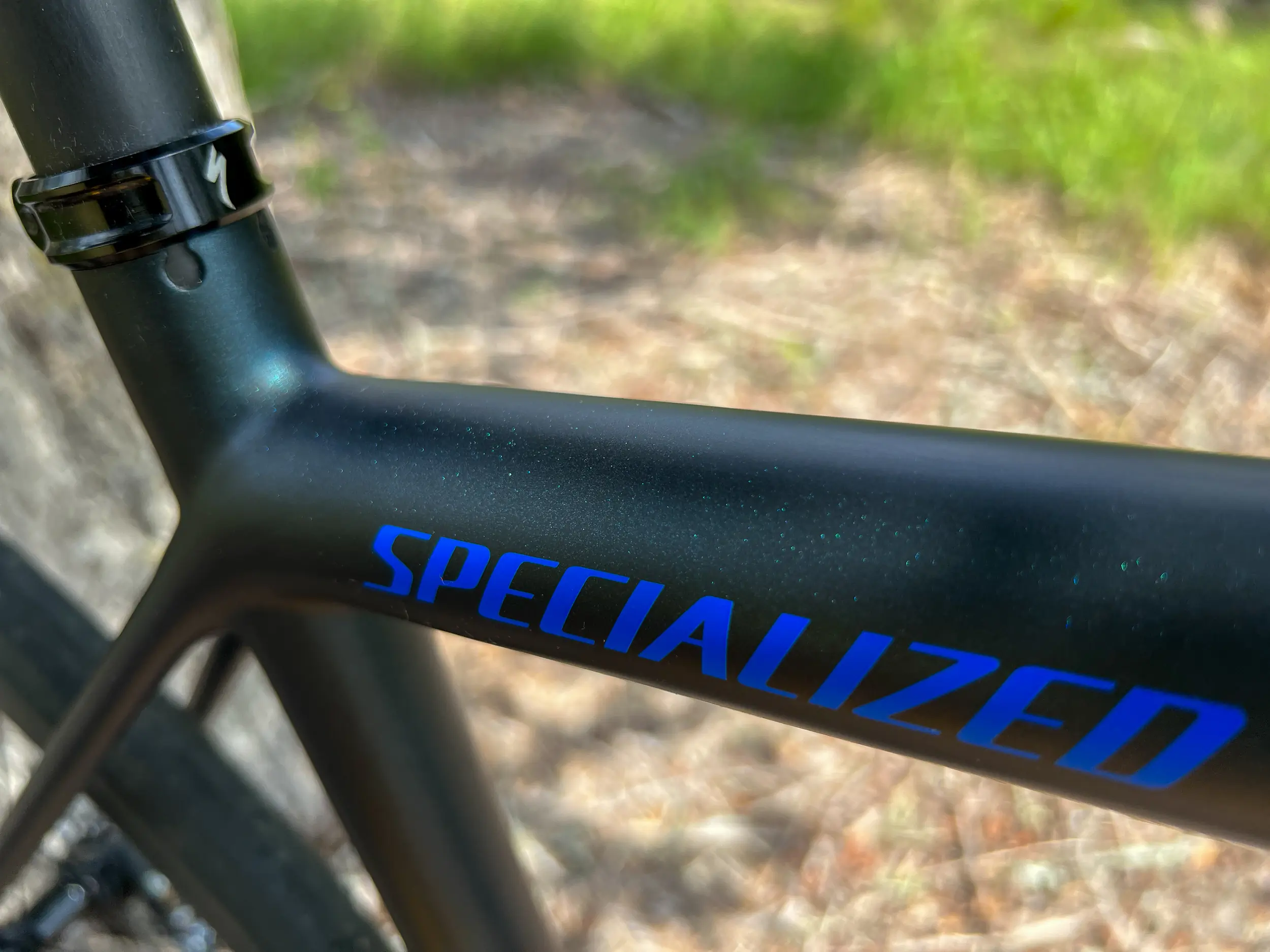 Even the aesthetics are muted and unassuming. No bright paint schemes and hardly a visible logo. The branding is unrecognizable from a distance. The “Satin Obsidian” paint looked drab at first glance, but closer inspection reveals purplish flecks that sparkle in the sun and a thin application of color that hints at the carbon underneath. I personally liked the stealthy looks, but it was a shocking break from the usually prominent Specialized logos.