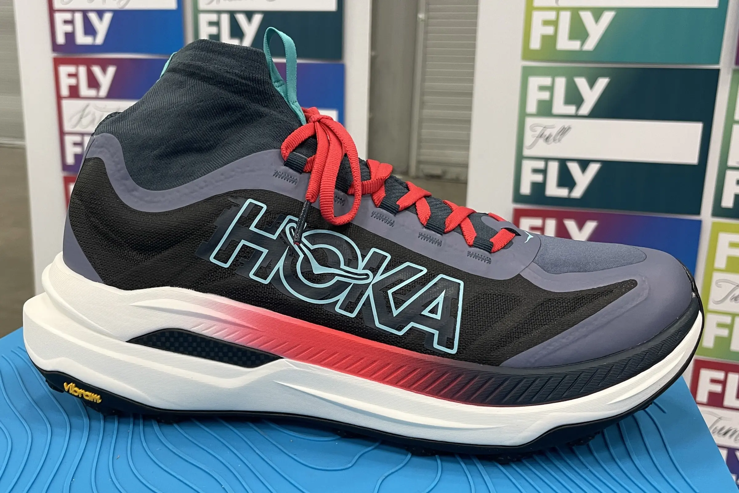 The mysterious blacked-out, high-collar shoe Walmsley wore to shred the UTMB course this year was on full display in Hoka’s TRE booth, though its bold colorway is unlike the prototype Walmsley wore.