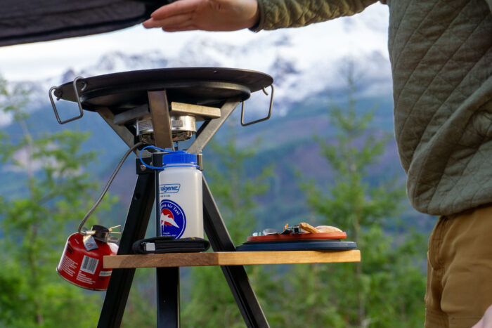 I found cooking with this to be more of a dance than anything. The bipedal stance required shakes up your typical camp kitchen structure, making for a more fluid environment. You might stir the asada on the way to grabbing something out of the tent, or shuffle around the side of the Disco camping skillet to better flip the tortillas.