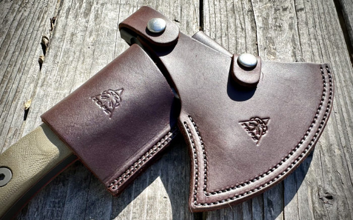 The Hammer Hawk comes with a full-grain leather blade cover and belt frog. The combination of these pieces allows you to safely transport the axe on your belt and allows for easy retrieval. By design, the belt frog keeps the Hammer Hawk from swinging around while practicing parkour in the woods, and a small pocket allows you to carry a small skeletonized knife like the TOPS Backup knife.