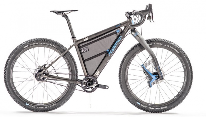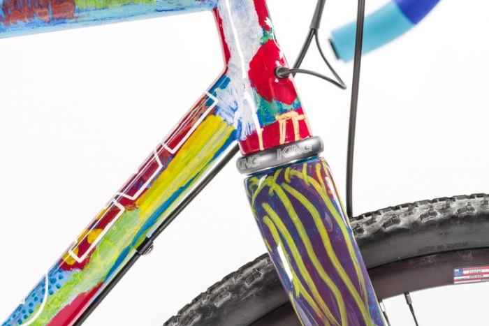 Dubbed the “Thunder Pig,” this bike’s semi-slack, semi-steep geometry is called “neuveau XC” by maker Pete Olivetti. I just want the swoopy custom frame bag.