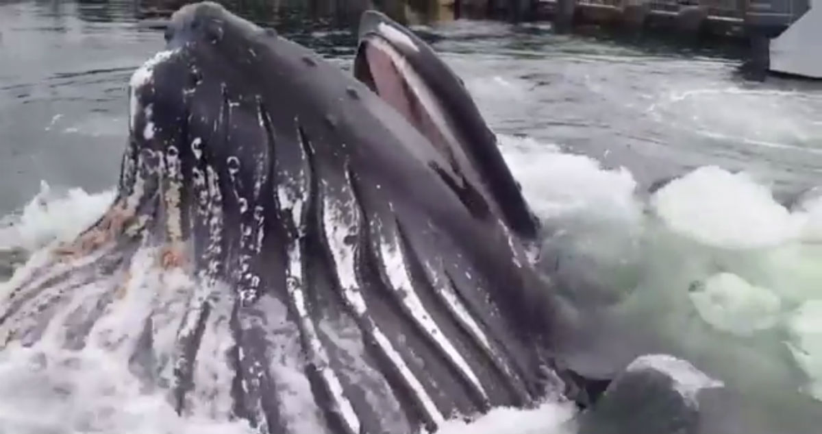 [leadin]In amazing footage taken near an Alaskan harbor, the giant maw of a humpback whale erupts from the depths amidst docked sailboats and stunned onlookers.[/leadin]