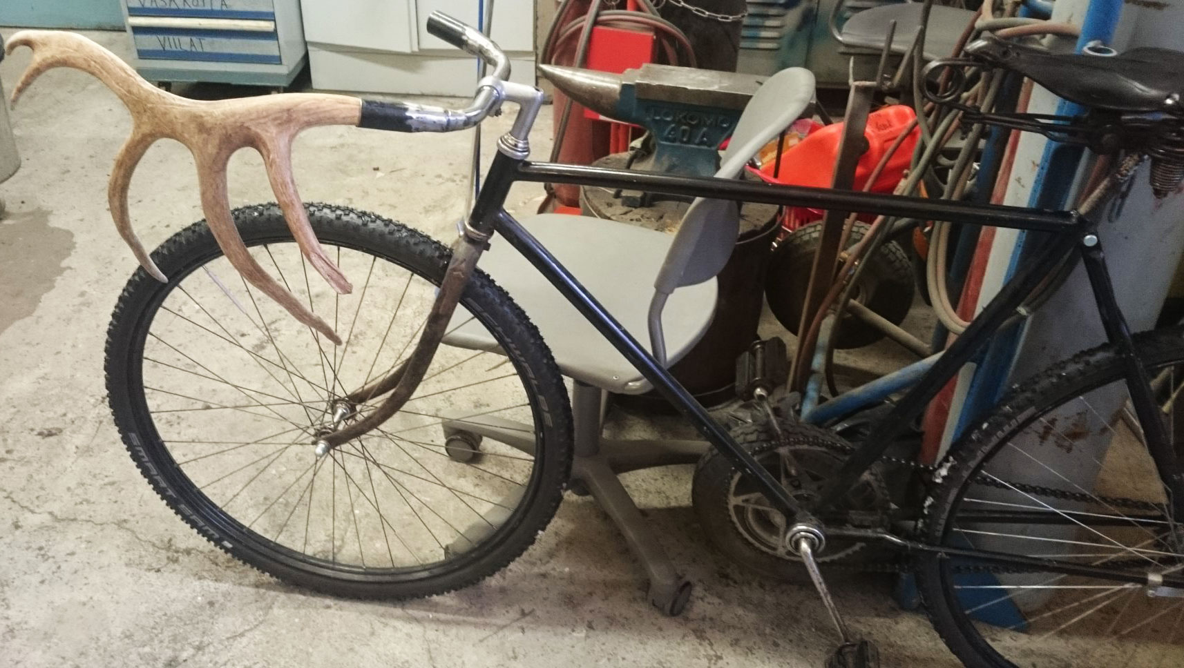 At a municipal DIY workshop, Tahkola sanded and shaped the antlers to fit. Initially, they were mounted tines-up. While it looked cool, it presented an unfortunate goring hazard. So Tahkola rotated them to dropper-style.