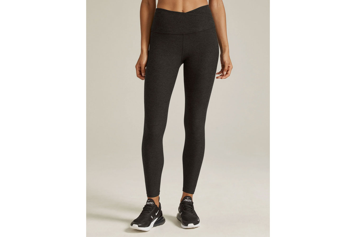Many tights now incorporate wide waistbands. A wider waistband allows for a more custom fit across a variety of body shapes. The Beyond Yoga Spacedye At Your Leisure High Waisted Midi Legging incorporates a wide and overlapped waistband that is comfortable and flattering for a wide variety of body shapes.