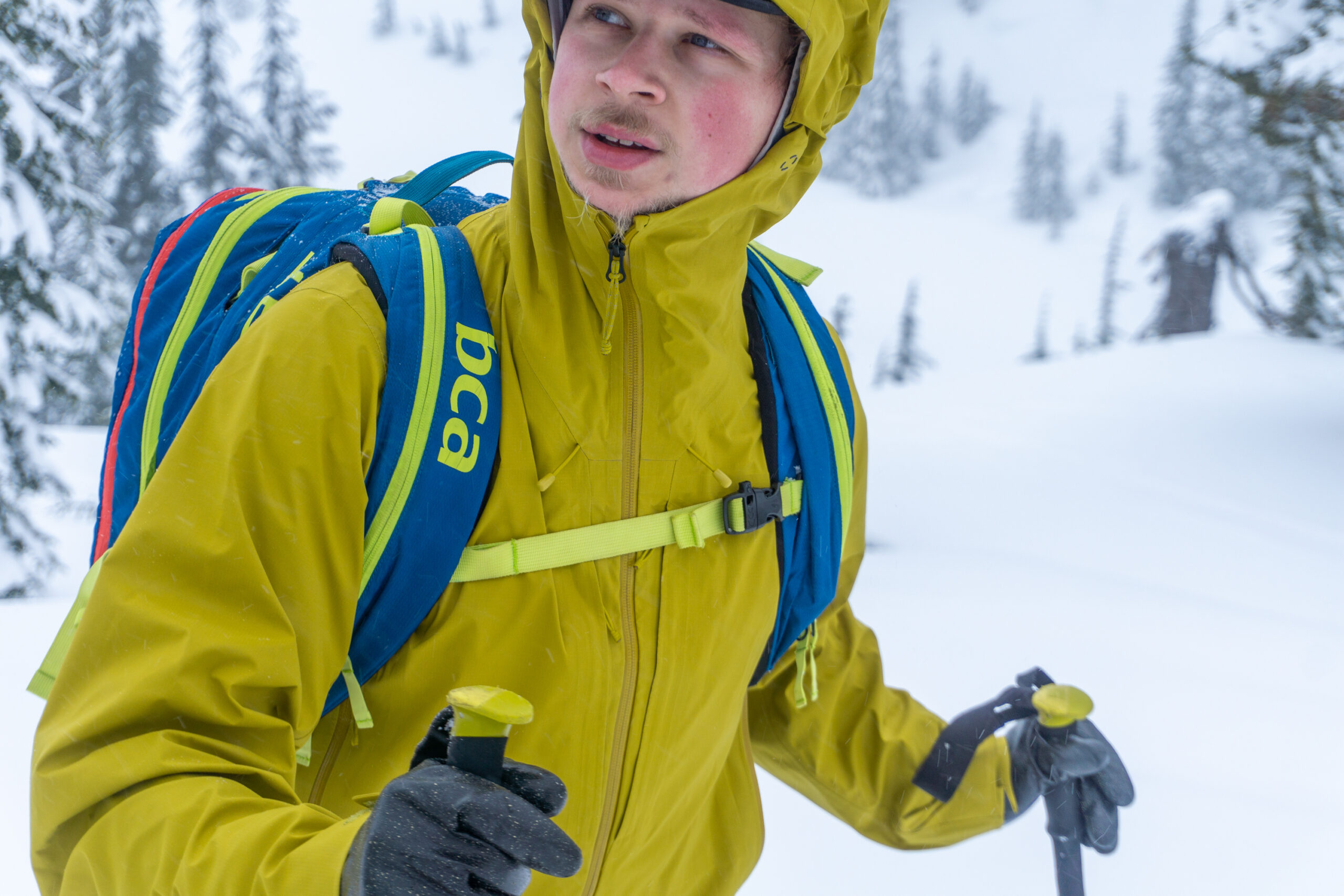 Many of the hardshell jackets in our review sport an “alpine” fit, meaning that they have a bit more space than your typical rain jacket to accommodate more active insulation. Some, like the Ortovox Westalpen 3L, are cut a bit more trim with the high output of ski-mountaineering in mind. Others still are a bit roomier for the other side of the ski equation, when you’ll want to be wearing all the insulation you’ll need for the day at once.