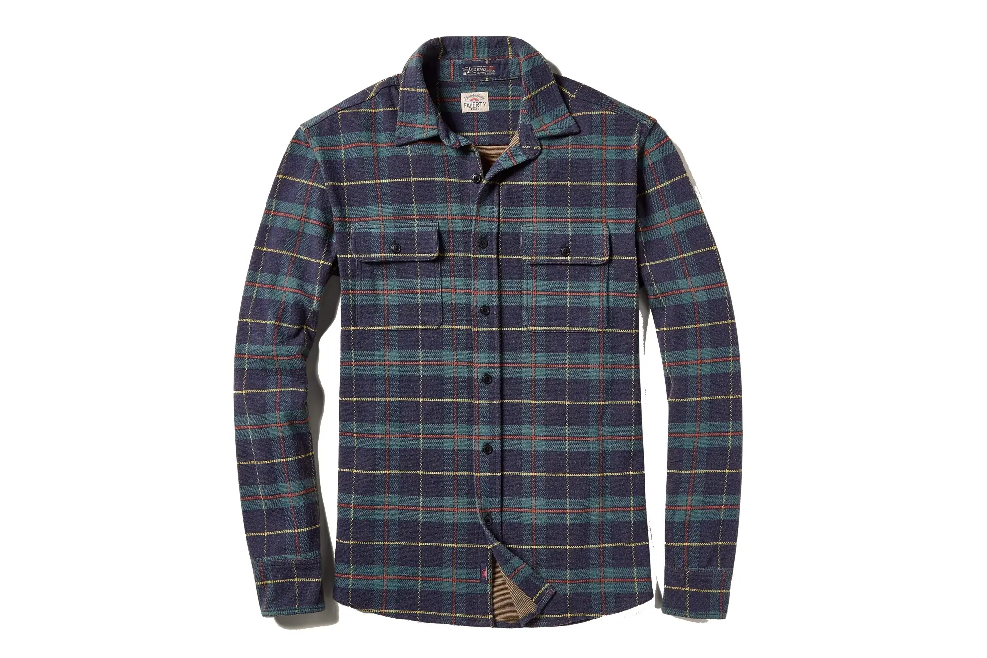 | Faherty Legend Sweater Shirt | $178 | 65% REPREVE recycled polyester, 30% Viscose, 5% elastane | ~300 g/m² | 1 lb., 3 oz. | Fitted, but very stretchy |