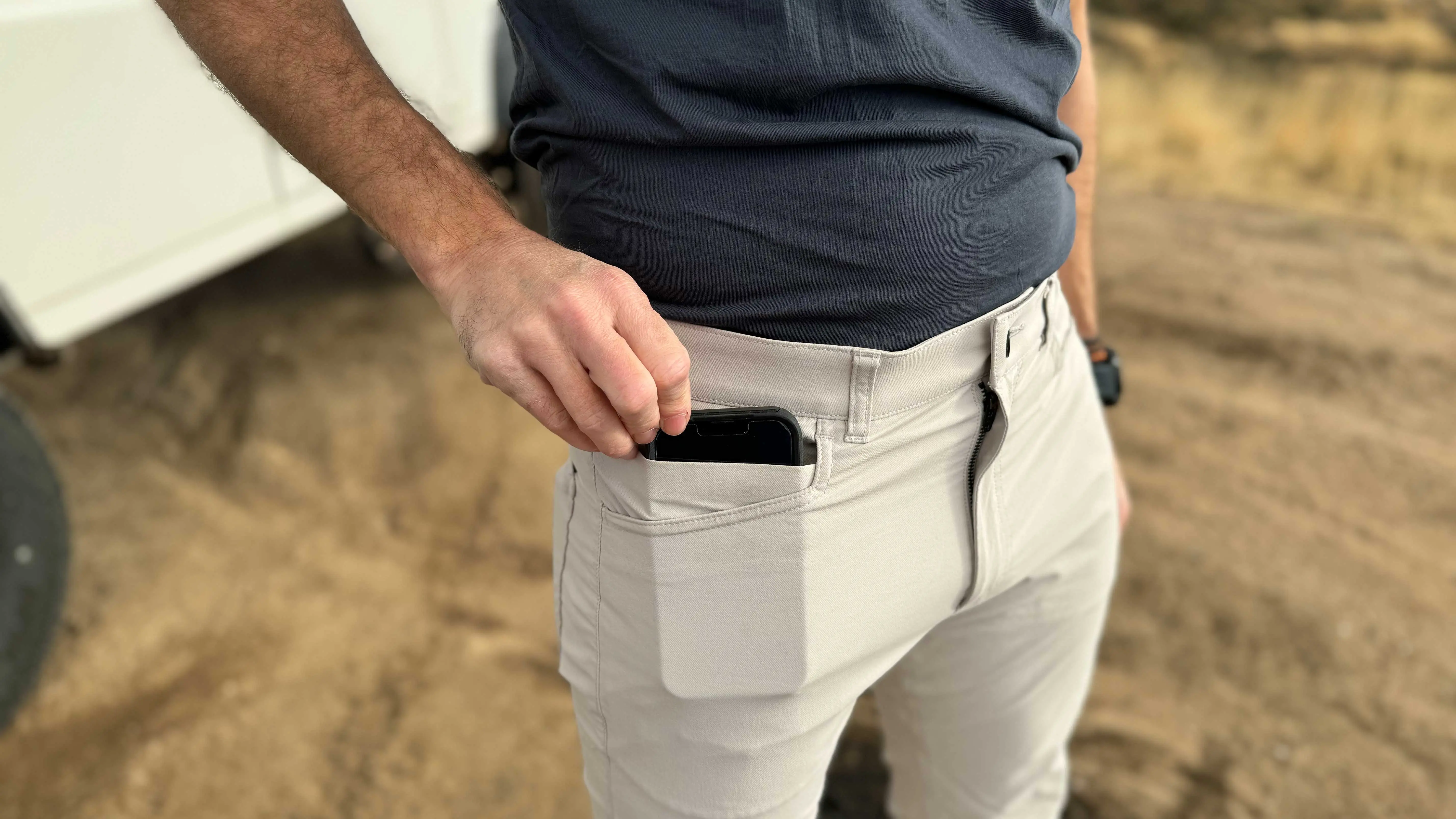 - Material and construction inspection: When we receive a new pair of pants, we first inspect the materials and build. We gauge the fabric weight, breathability, and the material’s ability to resist wrinkling. To be considered for our list, pants need at least one pocket that can be zipped shut to safely secure a passport or wallet. The hand pockets should be deep enough to keep keys and change from accidentally spilling out, or have zippers that prevent mishaps. We then evaluated each pant’s fit, durability, packability, ability to bounce back from repeated wash and wear, and unpacking.