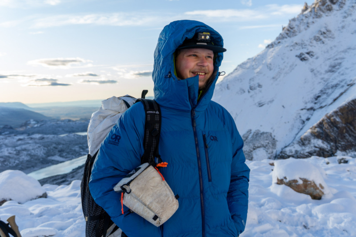 The waterproofed fabric won’t be as resilient as something with a true waterproof membrane, like the Arc’teryx Therme Down Parka, but it’s still on the more robust side when it comes to fabric denier (and notably thicker than the 20D face fabric used on the Feathered Friends Khumbu). Senior Editor Nick Belcaster used the Super Alpine to keep warm in Patagonia recently during the austral summer, when a freak snowstorm turned the mountains white for a week. “It was the perfect layer for rest breaks while trekking in the mountains,” he reported.