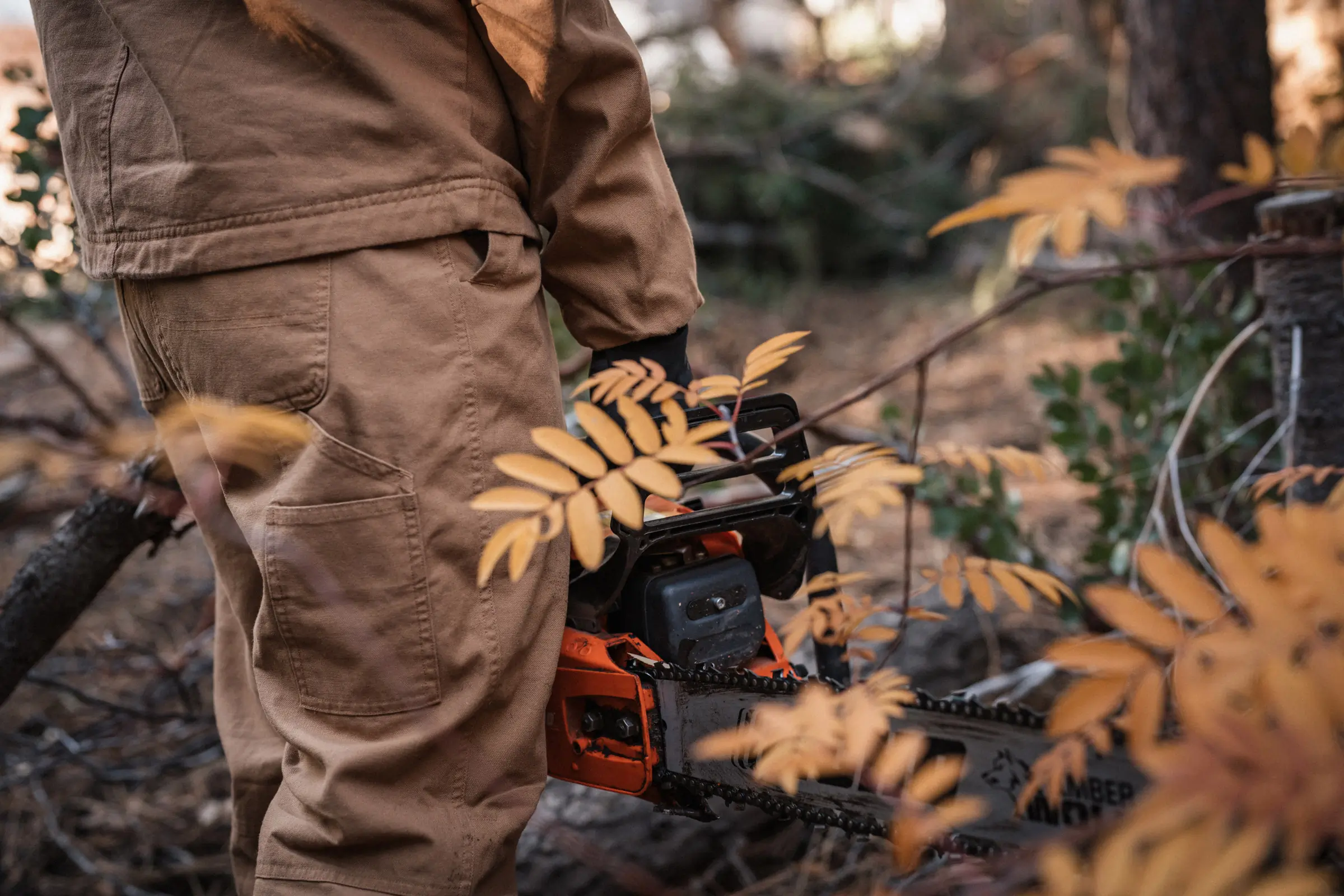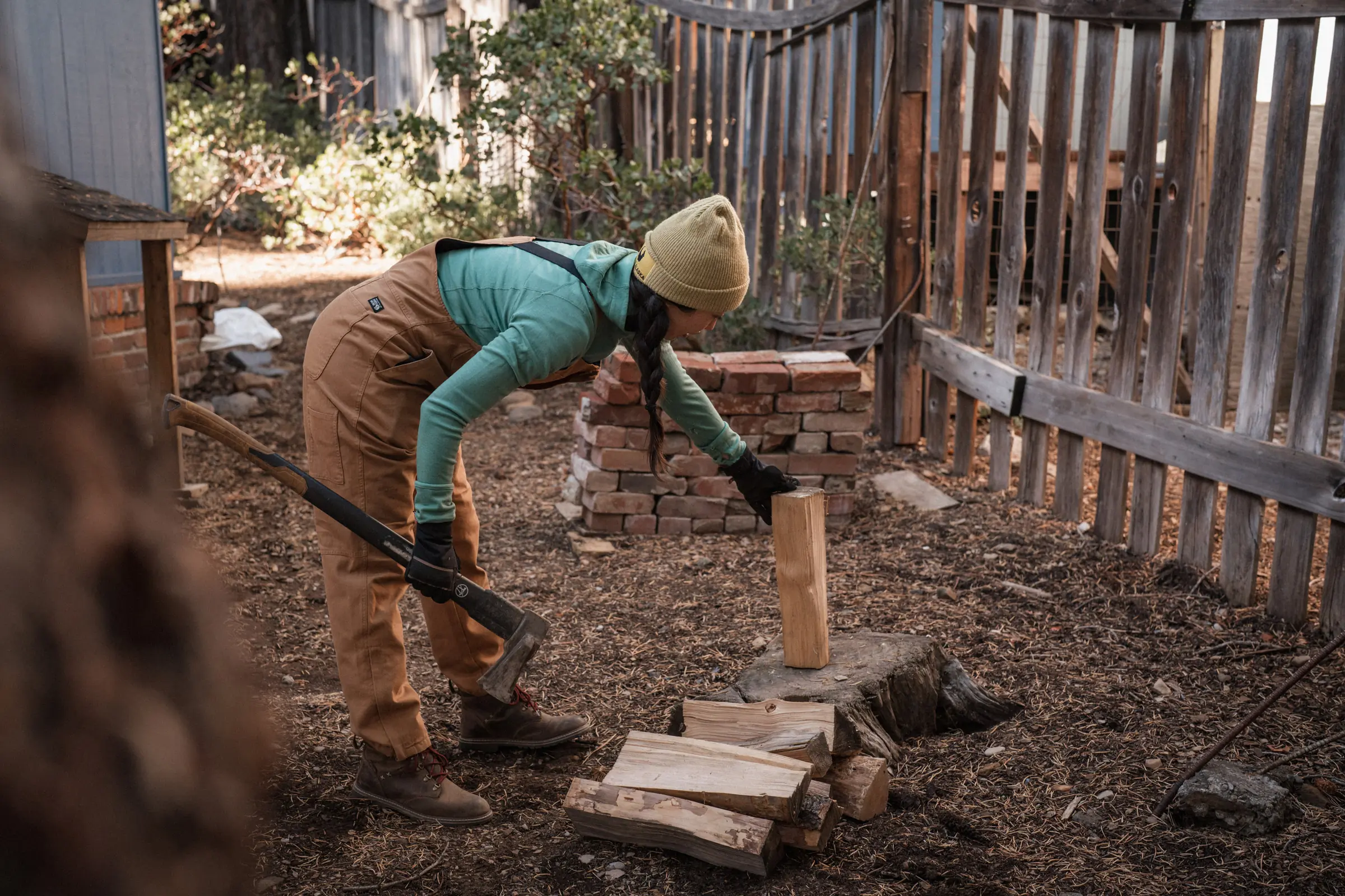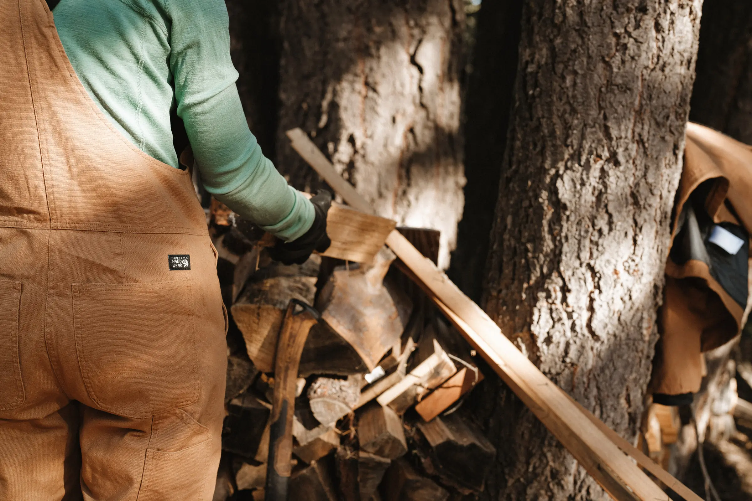 The bib version of the pant in action while chopping wood; (photo/Katie Botwin)