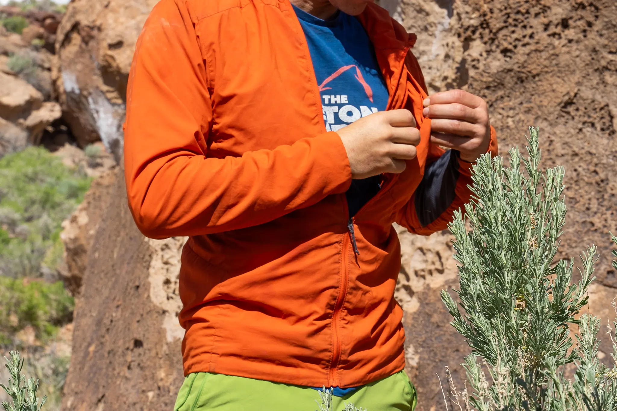 As a climber, I really like the Nano-Air Ultralight’s hood, fit, and chest pocket. The whole jacket stuffs easily into its chest pocket and clips to a climbing harness when the temperatures start climbing. I always appreciate a jacket that stows away, but sometimes brands make the pocket so small it’s a pain to get the jacket stuffed in there. Not so with the Nano-Air Ultralight.