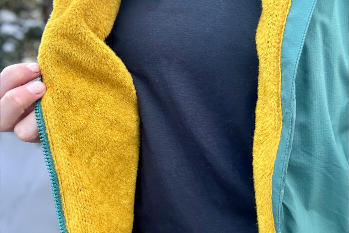 First, the vertical zippered chest pocket. This is essential for quick access to a card, snack, or lip balm when you’re out in the wild. And second, a two-way front zipper, complete with a fleece-lined chin guard. Two-way zippers are essential to have on outer layers when you are climbing.