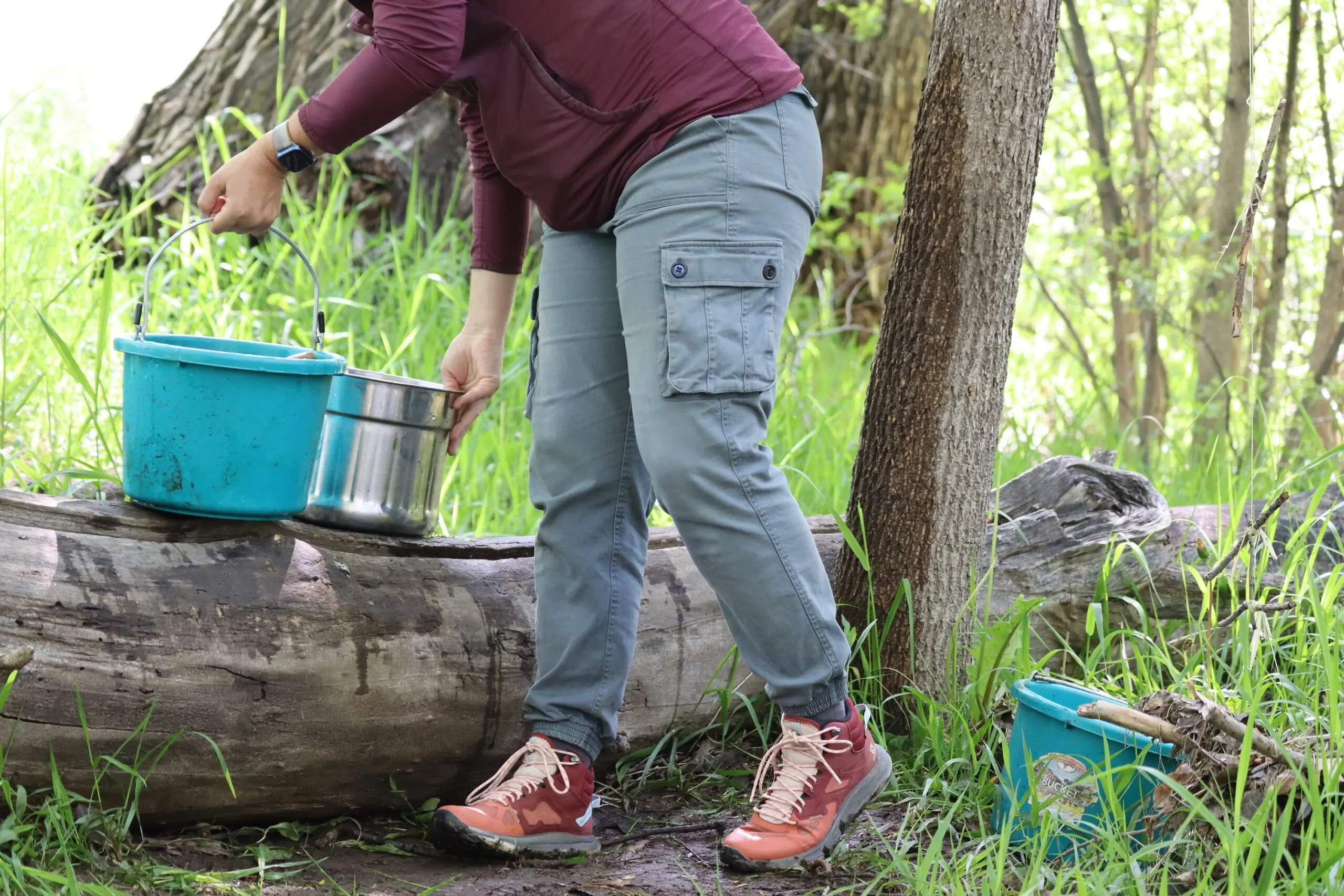 That means that I’m running around, digging in the dirt, and wading through a creek with about a dozen 4- to 5-year-olds on a daily basis. I’m sitting on pokey, damp stumps, rolling on dusty ground, and wrangling littles all while needing to have my phone, walkie, keycard, and half a dozen other items in my pockets.