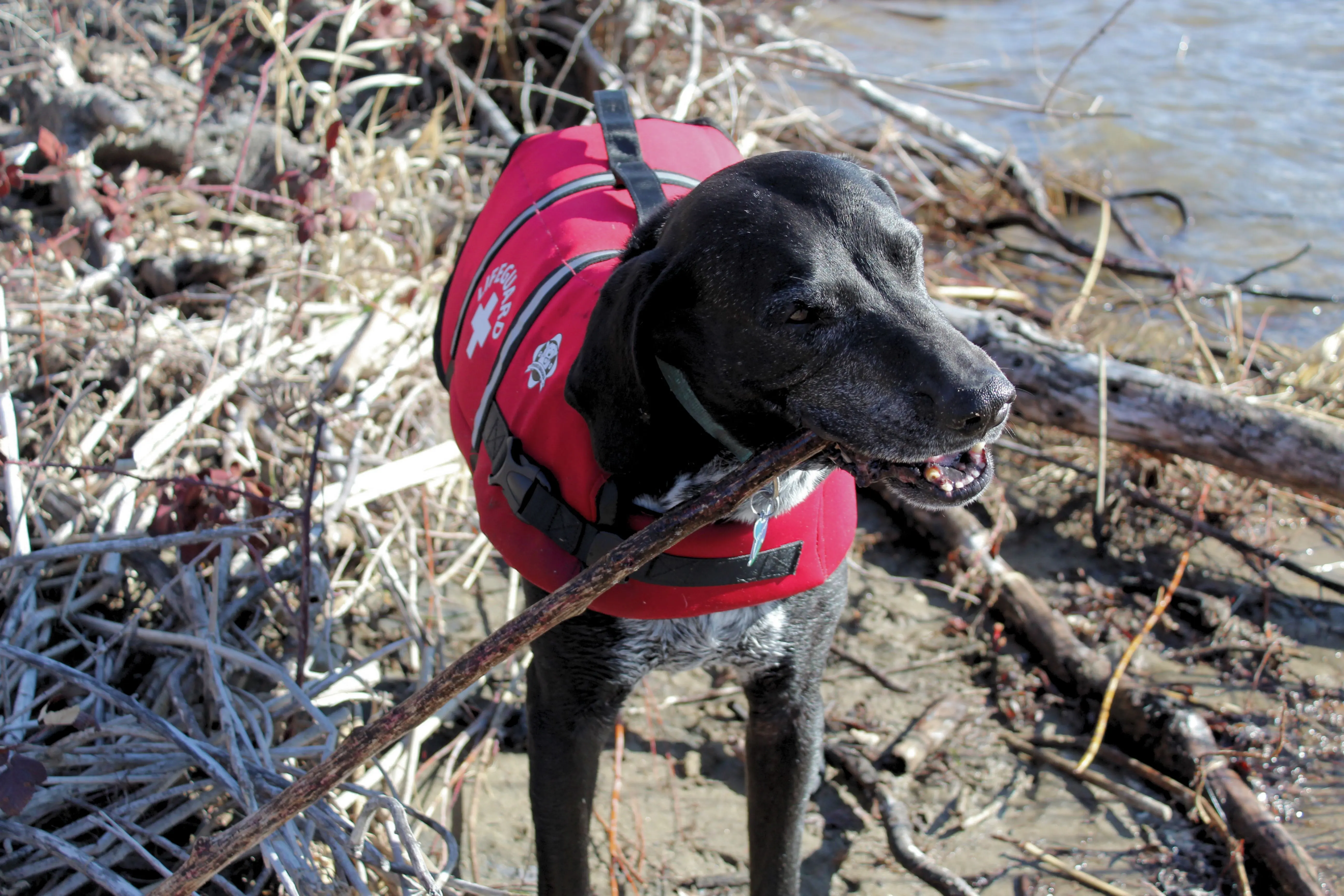 To condition tester pup Tundra to a life jacket, we had him wear the jacket for about 15 minutes a day for several weeks. The first few times, we had to use a lick mat to put it on him because he was unsure and didn’t want to move around once we adjusted it. After a few days, he started moving freely while wearing the jacket, but some dogs take longer than others. Meg’s other two dogs are less fearful of wearing things, so their conditioning period was much shorter. Her goal with any new activity is to create a positive association, and sometimes, that takes time to build.
