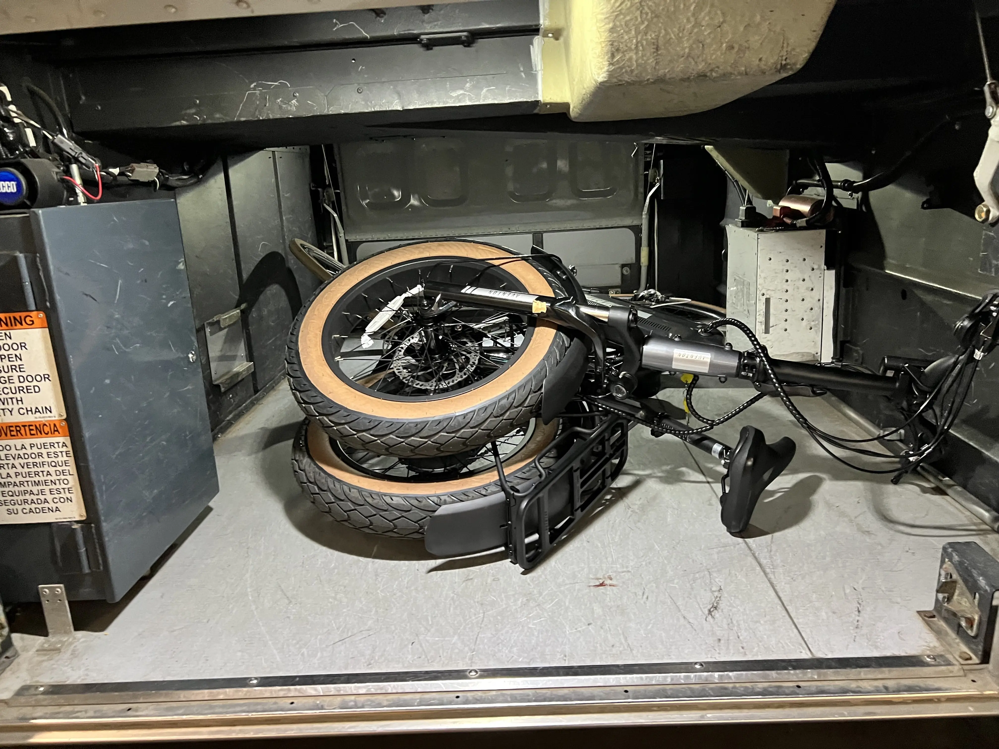 The bus arrived. People shuffled toward the door and started filing on. Then the bus driver got off, took one look at me and my bike, and opened up the luggage compartment underneath. I sighed with relief. I flipped the locking switch of the Aventon Sinch, folded the bike in half easily, hefted it, and slid it into the storage space. It fit, no problem.