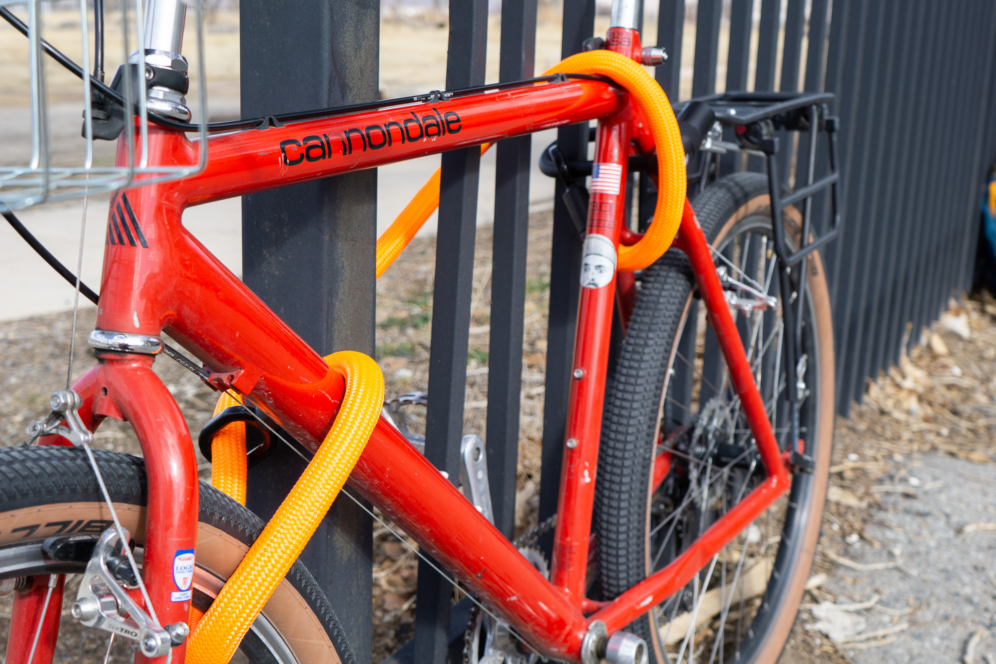 These locks use a braided steel cable that’s attached at each end with a lock. Cables can be cut extremely easily and silently, which makes them the number-one lock we have seen bike thieves seek out when stealing bikes.