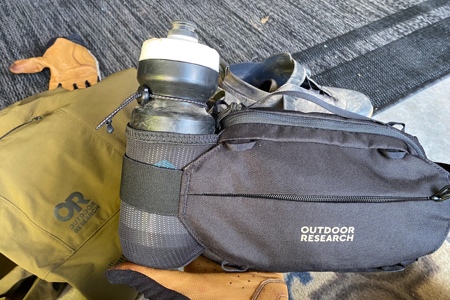 The bottle-carry models can usually handle one or two 20- to 25-ounce bottles, which may be more than enough for your needs, especially if you’ve already got a bottle on the bike. Both the Fox Standard Hip Pack and the Patagonia Dirt Roamer can carry two bottles in sleeves on either side of the storage compartment.