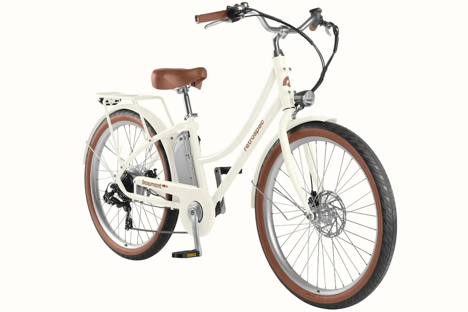 A flagship model in Retrospec’s e-bike line, the Beaumont Rev 2 is by far the brand’s overall bestseller. The convenient, step-through frame adds to the bike’s vintage look while supporting an upright riding position.