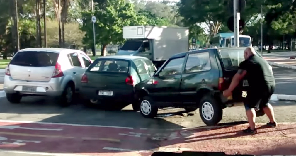 Well, that’s one way to get a car to quit parking in the bike lane. Also, that is one strong Brazilian!