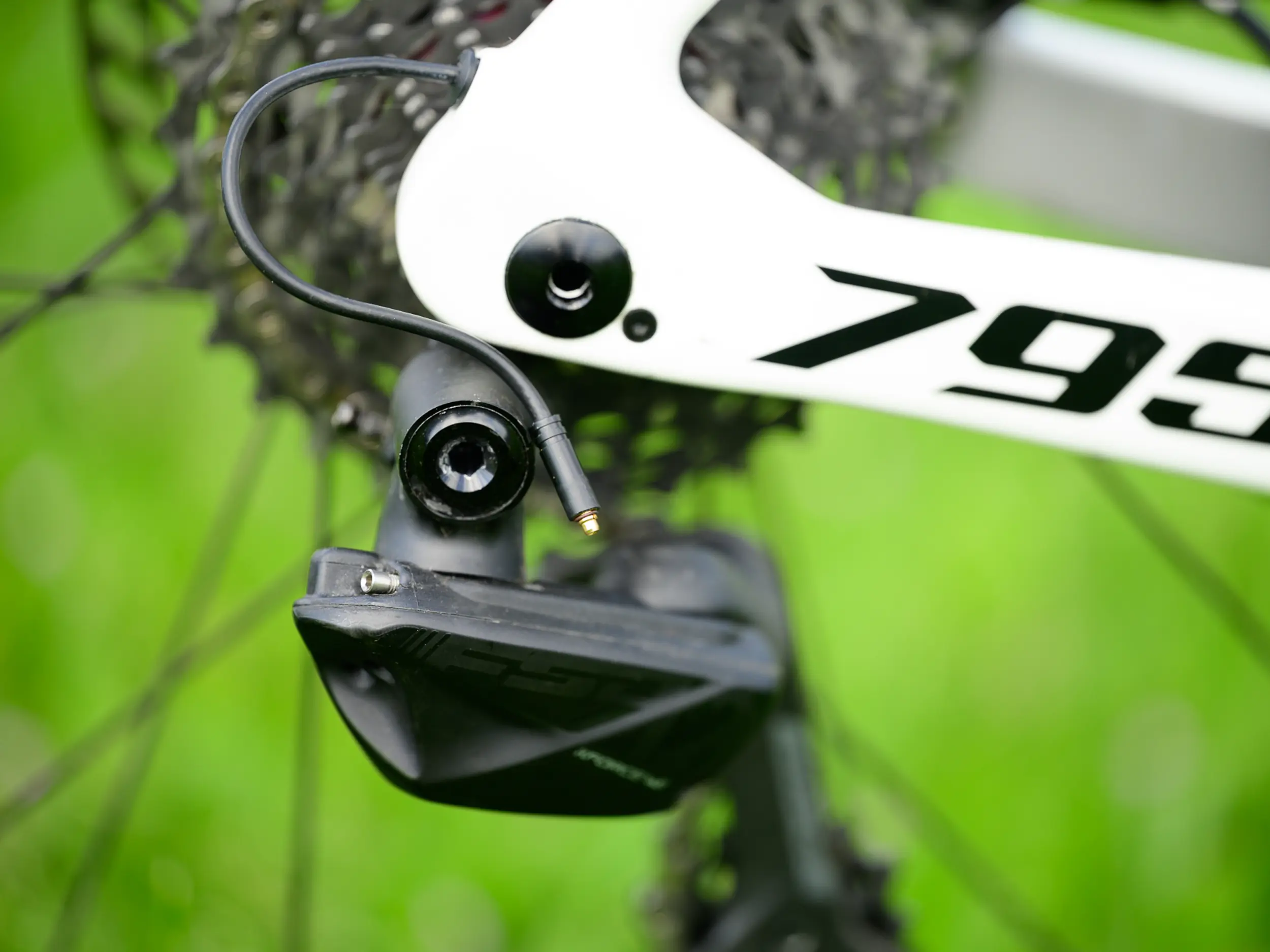 The rear derailleur acts as the master, which means it’s possible to run the group as a 1x system. When it’s time to charge, you’ll need to pull the cable from the rear derailleur where it exits the frame and plug it directly into the charger. Unlike Campagnolo, the cable joins are small enough to fit Shimano-compatible frames, and there are no junction boxes.