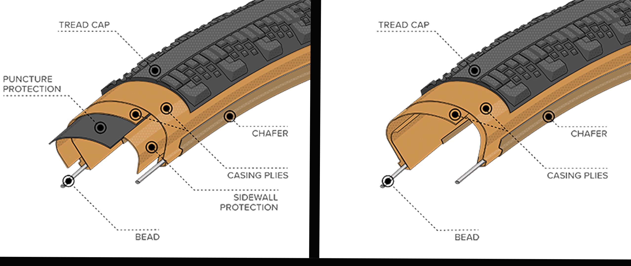 Teravail offers two tire casings: Durable bead-to-bead and Light & Supple. Durable bead-to-bead is the more robust composition, with a woven nylon layer in the sidewall and tread cap to protect the tire against punctures, abrasions, and lacerations. Light & Supple will roll more comfortably and weigh less, but it offers less puncture protection.
