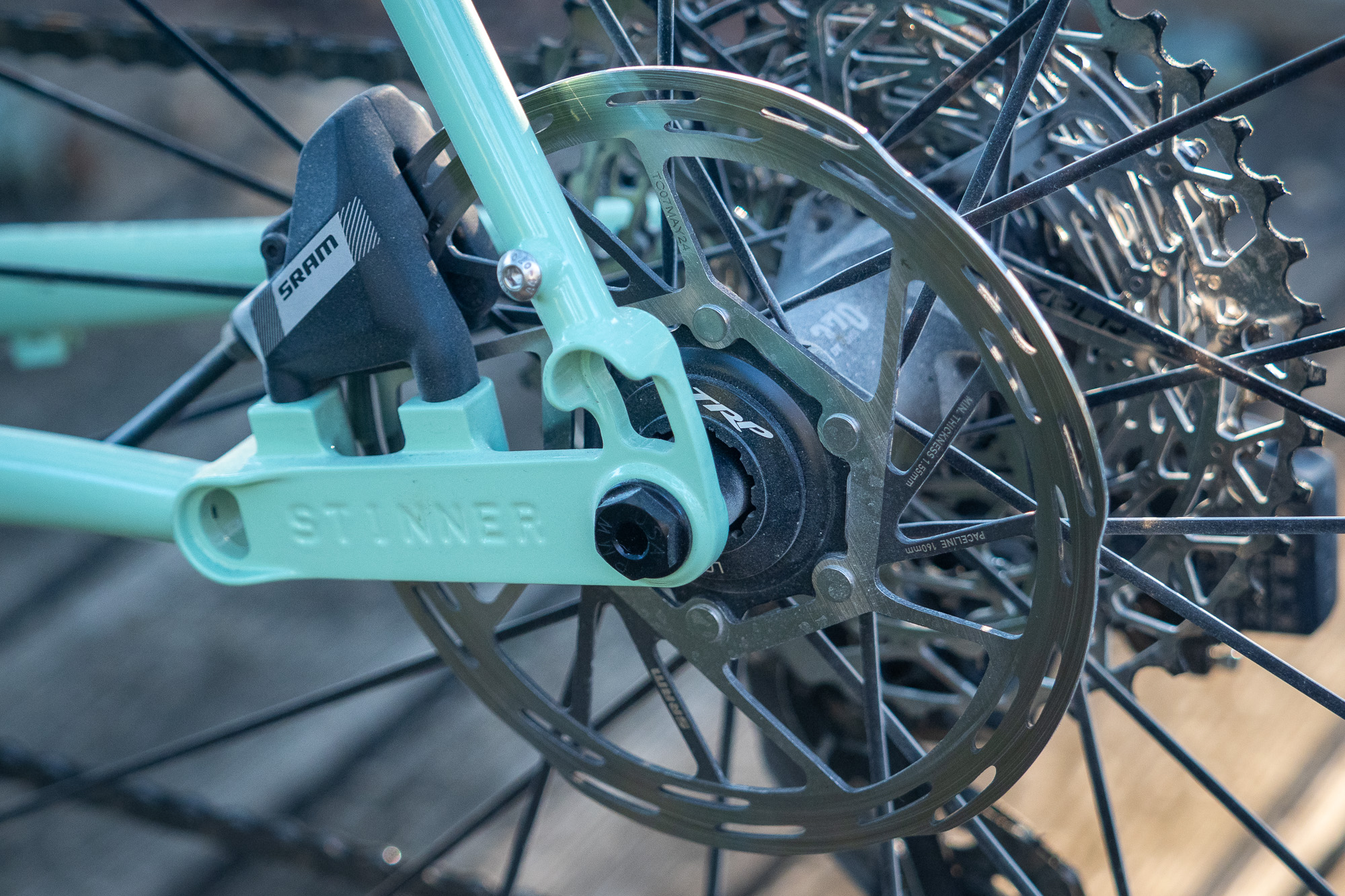 I thought Stinner’s carbon fiber fork was a good choice. Carbon forks are stiffer than steel ones, and this kept the front end from being overly forgiving against torsional and lateral forces.