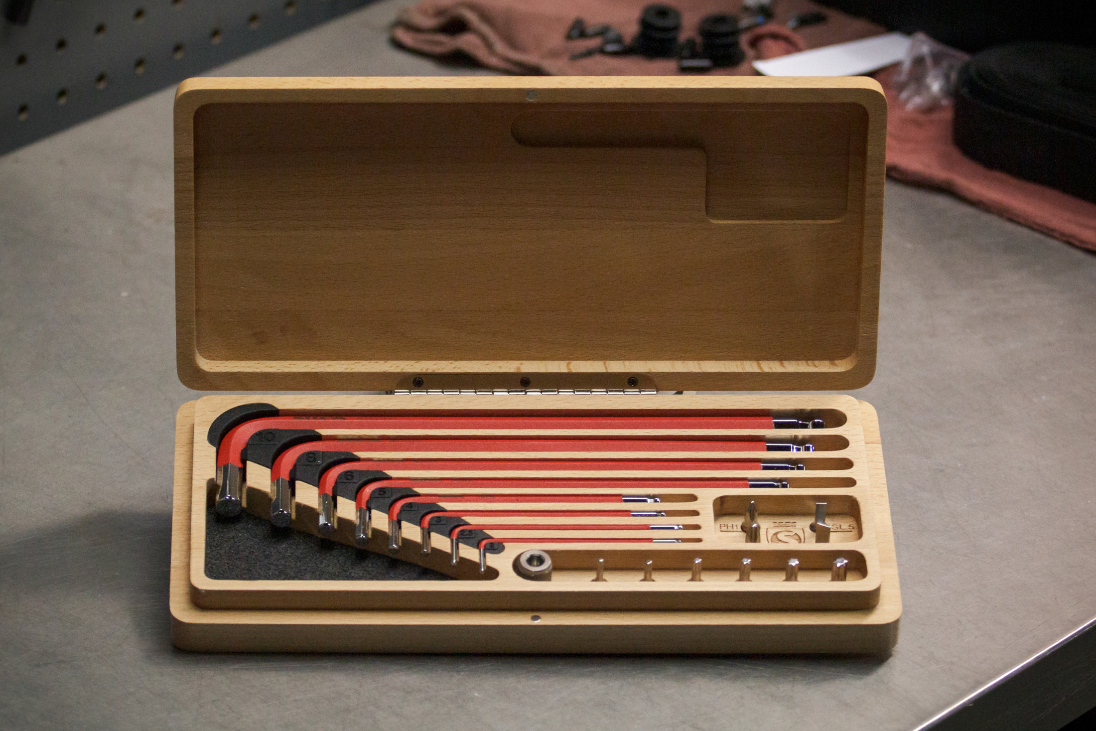 The set’s hex-key wrenches range from 2 mm to 10 mm, with a magnetic adapter that converts the 6mm wrench into a ¼-inch socket driver for the six Torx, two Phillips, and two flathead bits. Each tool fits a designated, CNC’d slot inside a hand-crafted beechwood box.