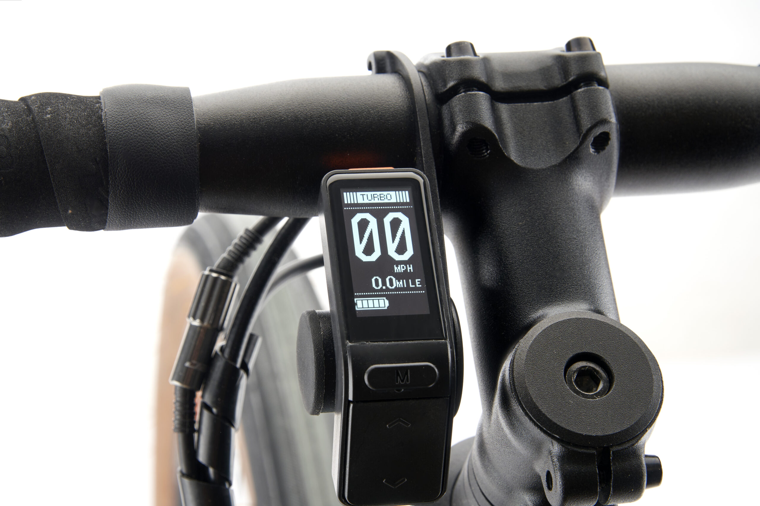 The drive system offers Class 1 pedal assist (no throttle) up to 20 mph. Riders can select from four assist modes — Eco, Tour, Sport, and Turbo — plus a Walk mode. A discreet handlebar-mounted combo controller/display unit controls the system and has readouts for data, including assist mode, current speed, trip distance, percentage of remaining battery life, and more.