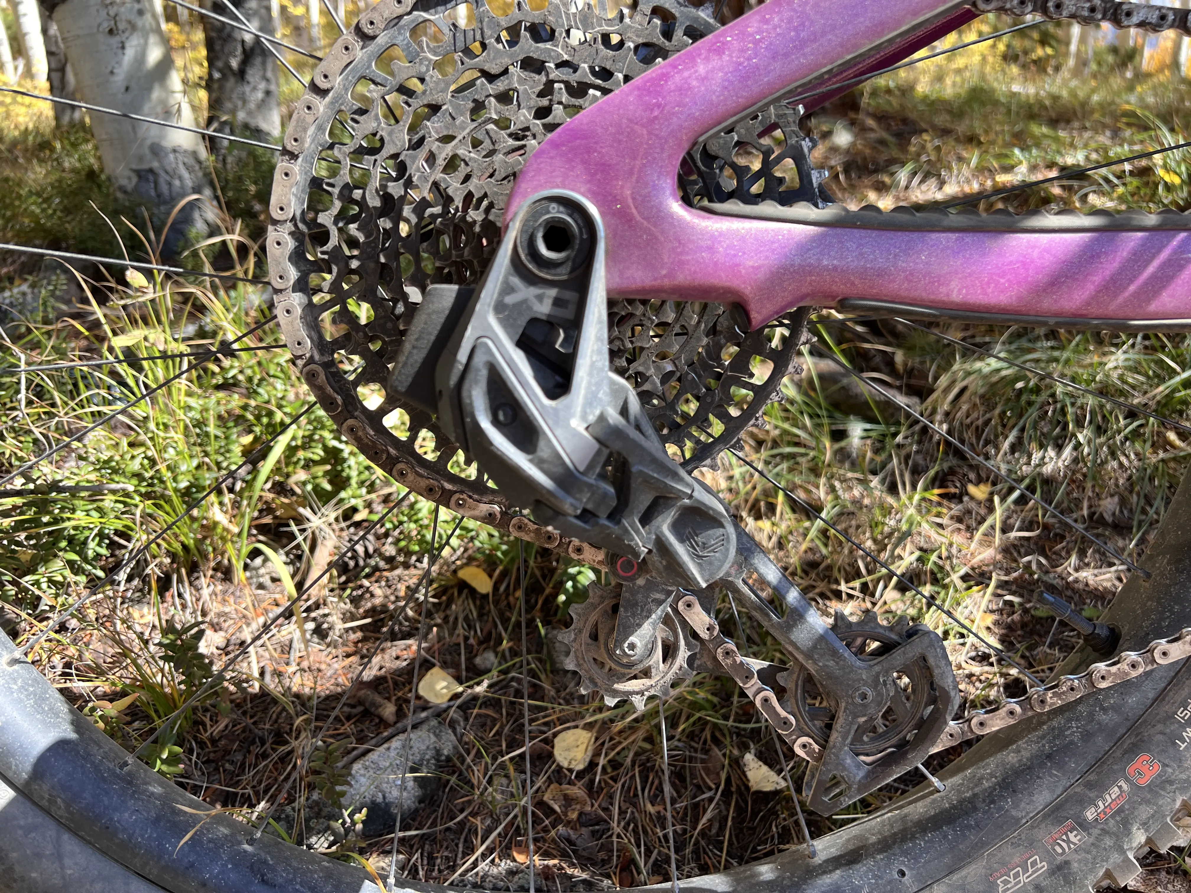 A strong selling point of SRAM’s Transmission derailleurs is its ability to shrug off serious impacts. That’s good in theory, but it didn’t work in this instance because the pully cage didn’t retract after getting hit. The mechanics checked everything and tightened everything to spec, and I continued to test-ride the bike.
