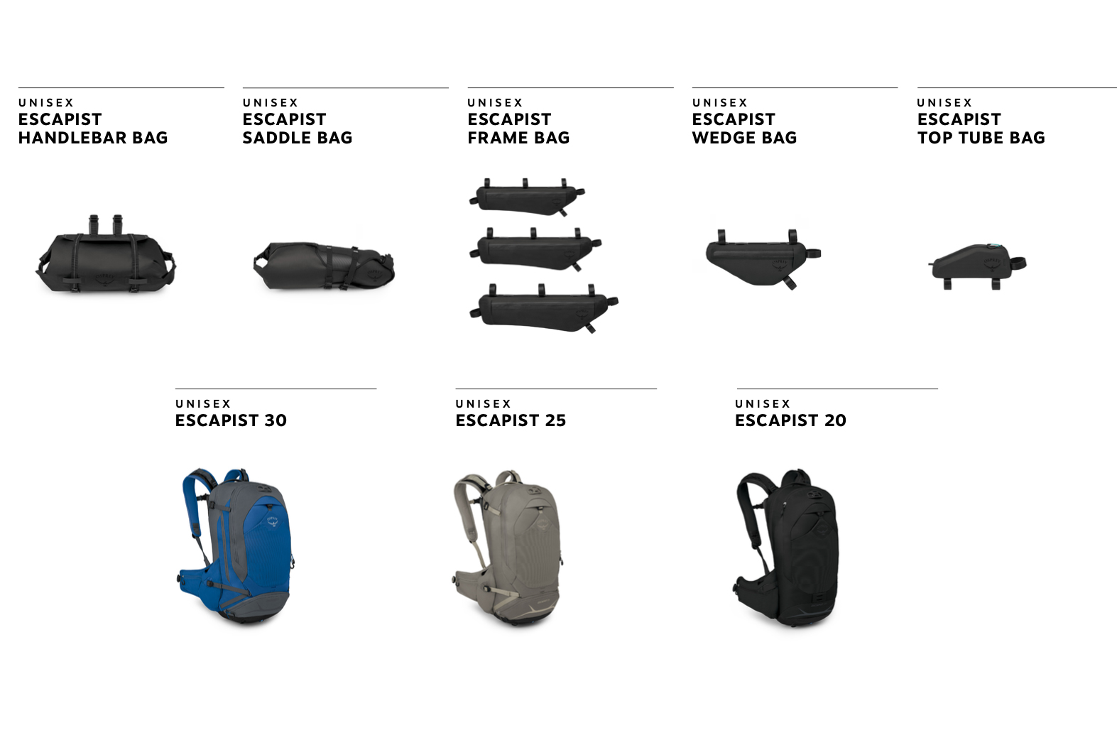 For spring 2024, Osprey releases the Escapist collection, a full suite of bikepacking gear. The collection includes three sizes of frame bags, a wedge bag, a top tube bag, a handlebar bag, a saddle bag, and backpacks.