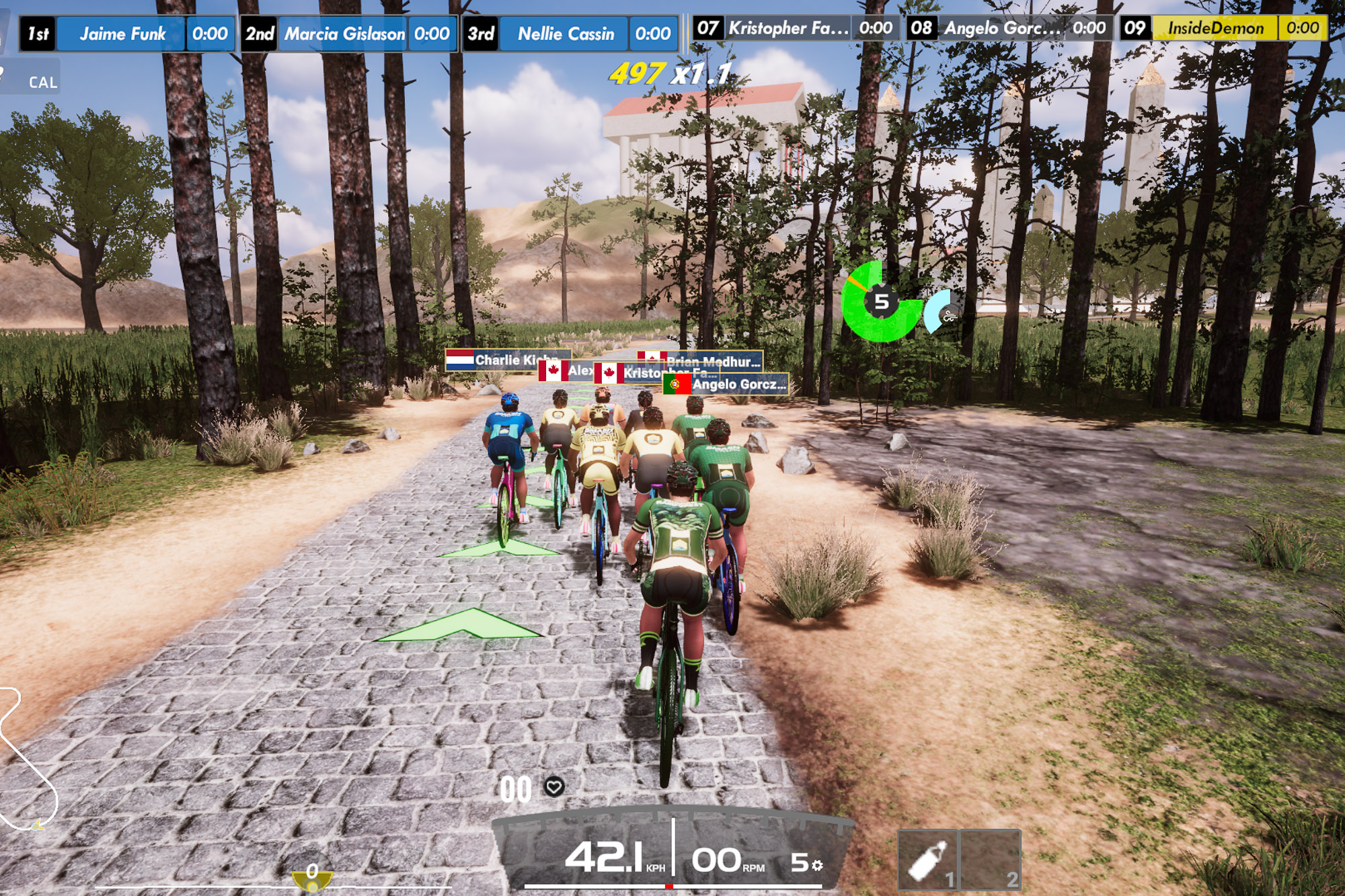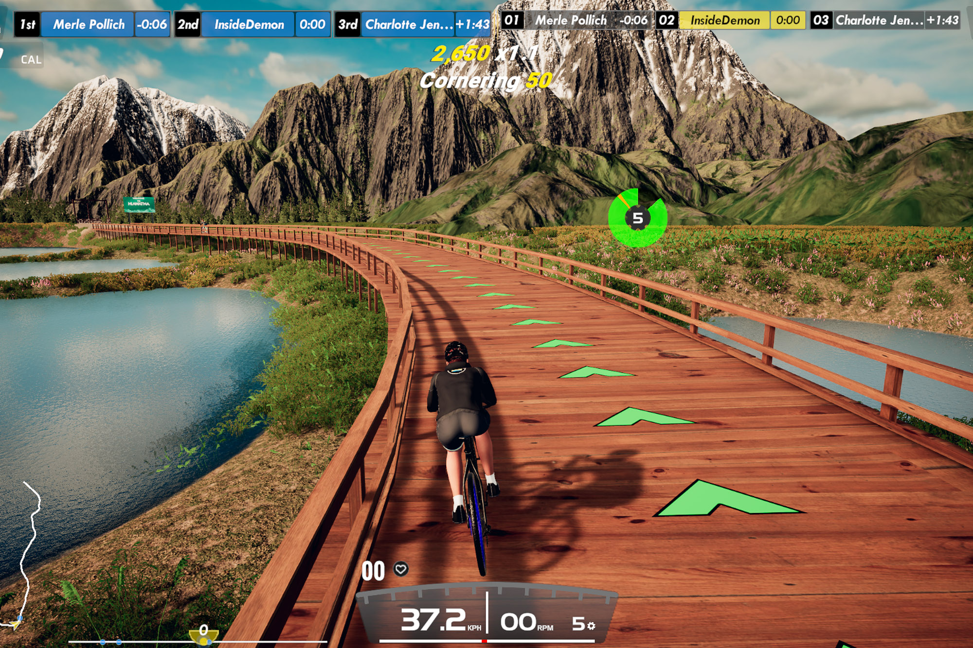 I was immediately thrust into a virtual group, and it soon became apparent that pushing harder on the pedals to generate more power didn’t matter. I could generate huge wattage numbers (I was not syncing my smart trainer to the platform), but this ability didn’t put me out front. Only leg speed mattered.