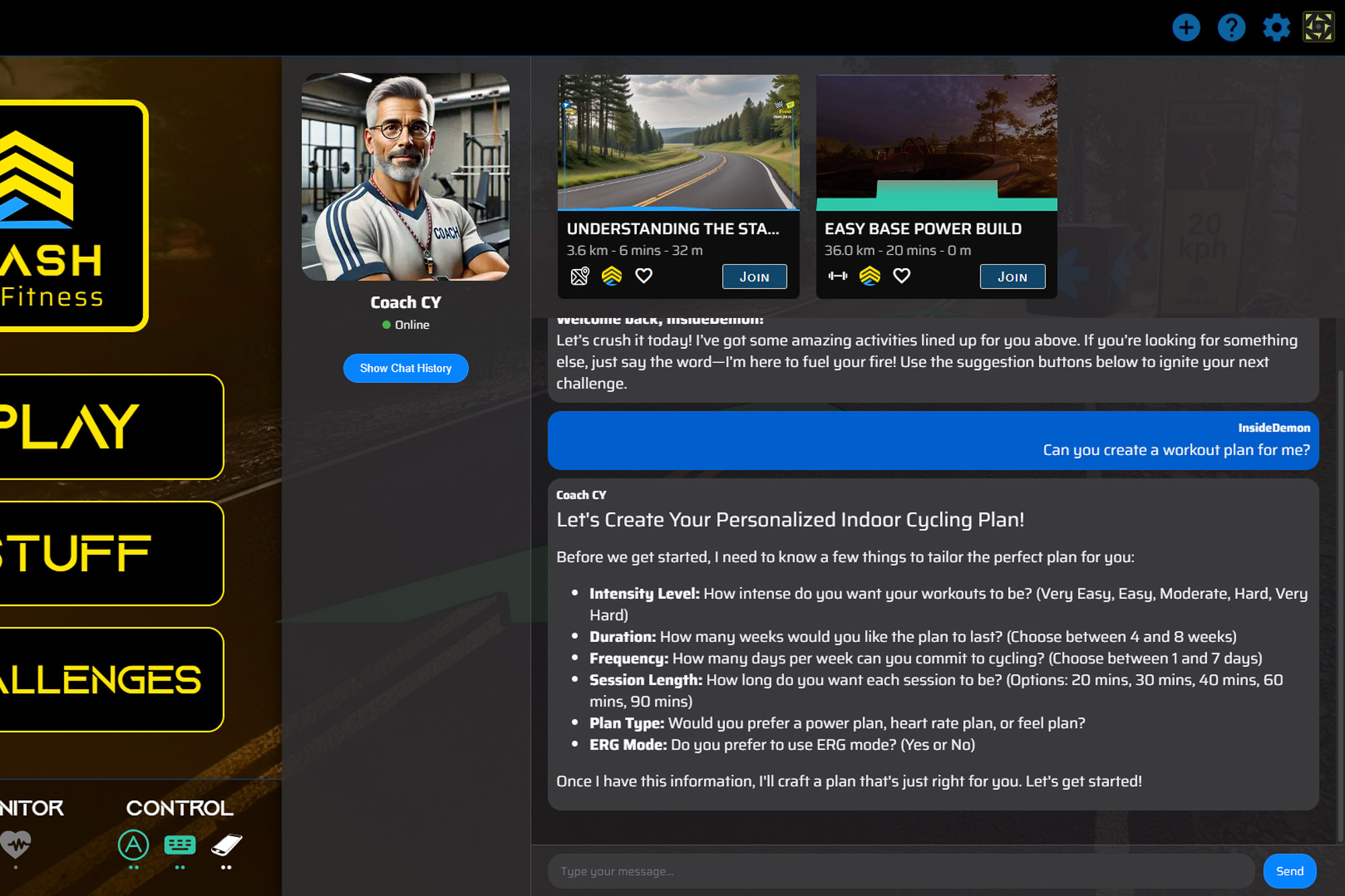 Smash Your Fitness can also provide coaching. An AI “coach” describes structured workouts and advice and can base effort levels on power, heart rate, or perceived effort.