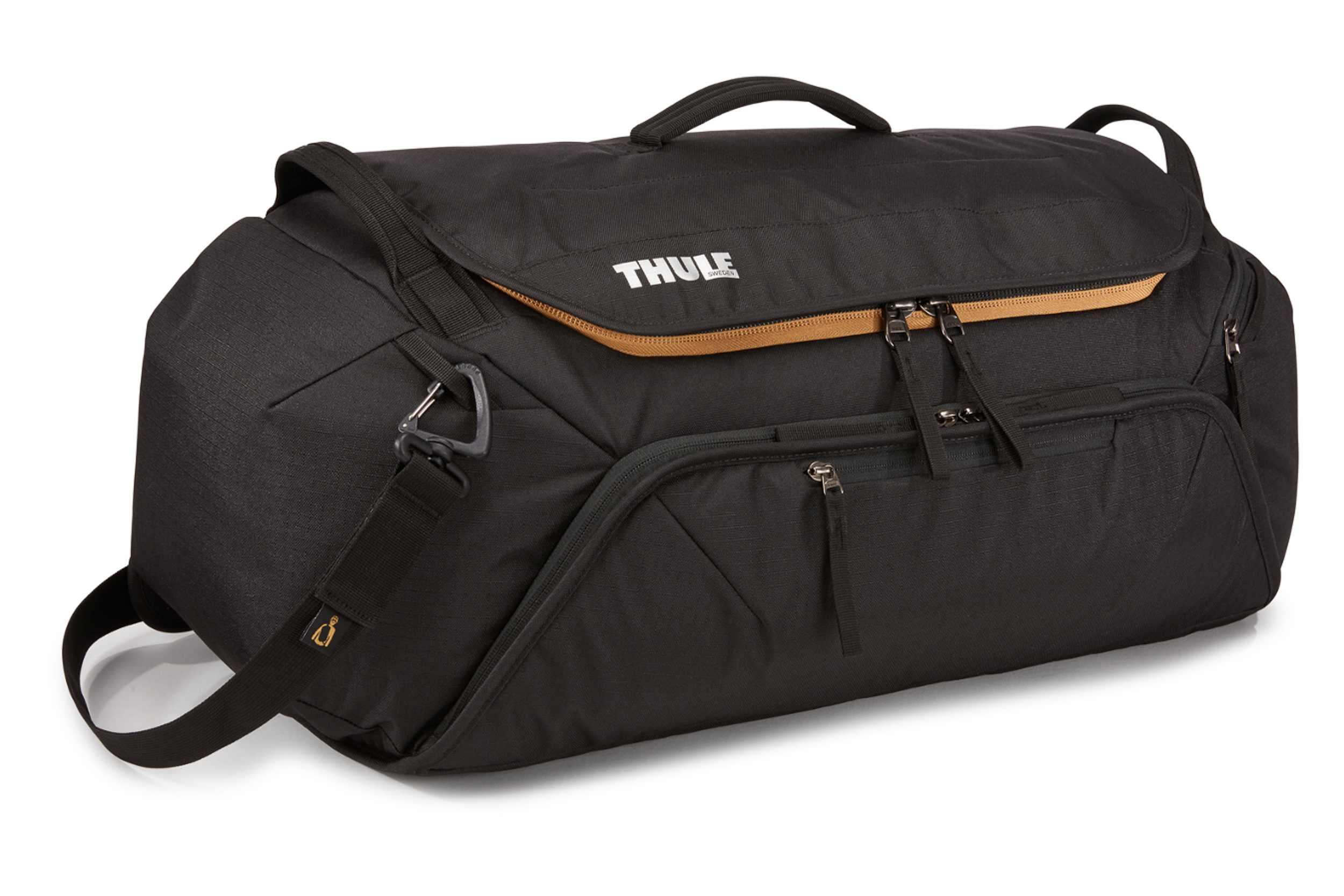 The front of the bag has a wide, zipped compartment with an internal divided mesh pocket, elastic straps to secure items like a mini-pump, and a small external zipped flat pocket. A padded shoulder strap that connects on opposite corners and three generous grab handles on top complete the Thule RoundTrip.