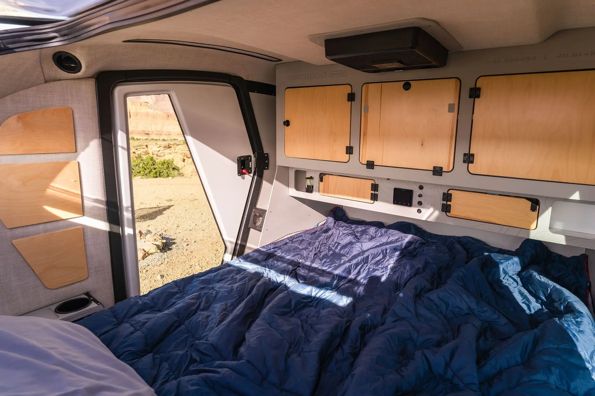 The Escapod’s fully insulated cabin includes several storage cabinets and nooks. It has larger storage areas behind the angled headboard/backrest for sitting up. Among the cabinets are the control panels for the lighting, fan, heat, and solar panel battery. For warmth, the trailer runs forced-air heat off of a traditional propane tank. The warm air exits through vents by the doors and overhead.