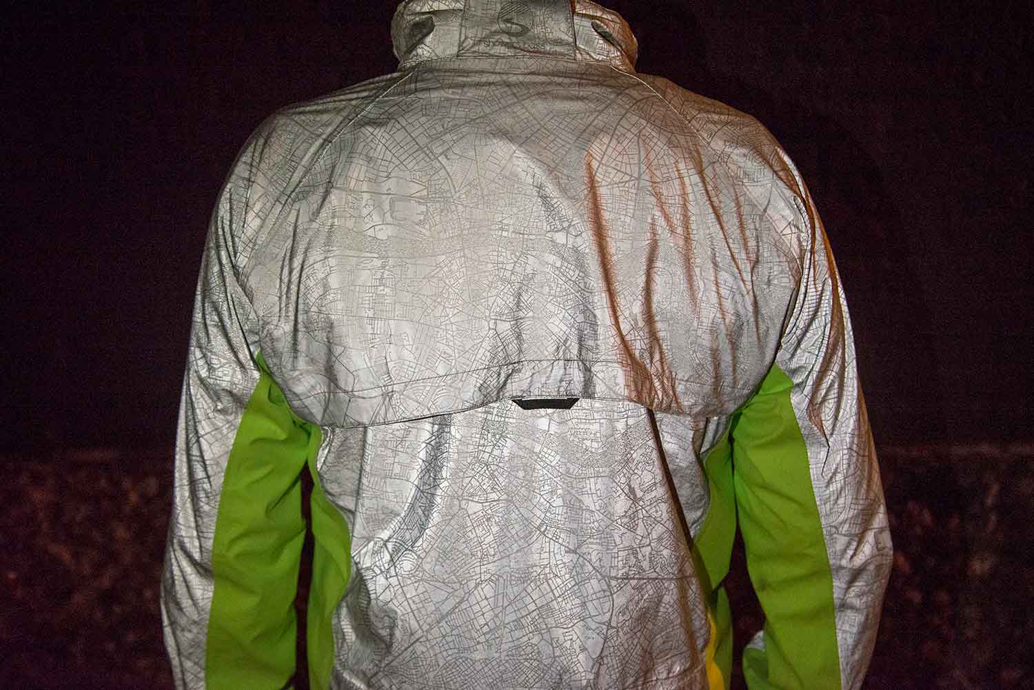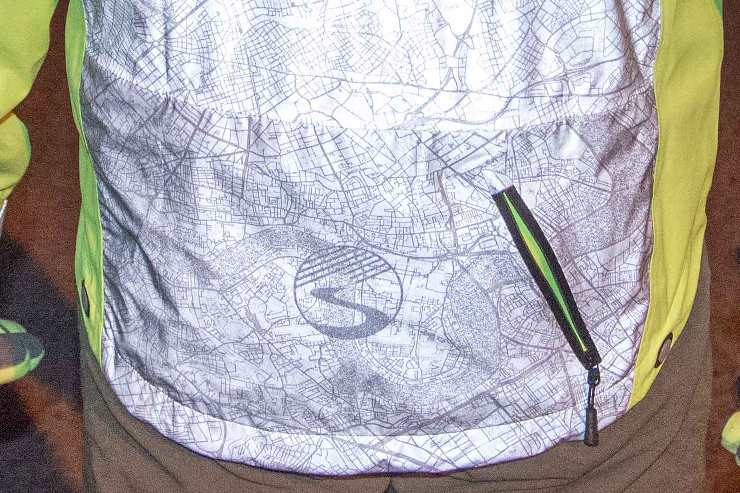 A pattern of 11 international “cycling-friendly cities” decorates the brand’s “MapReflect” fabric, which covers most of the coat. The side panels from the cuffs to hips are high-vis yellow.