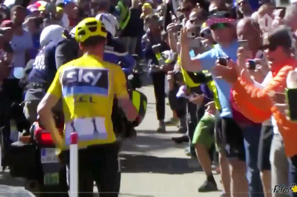 Froome’s mad dash through the crowd-choked streets of Mount Ventoux resulted from a three-bike pileup with a motorbike.