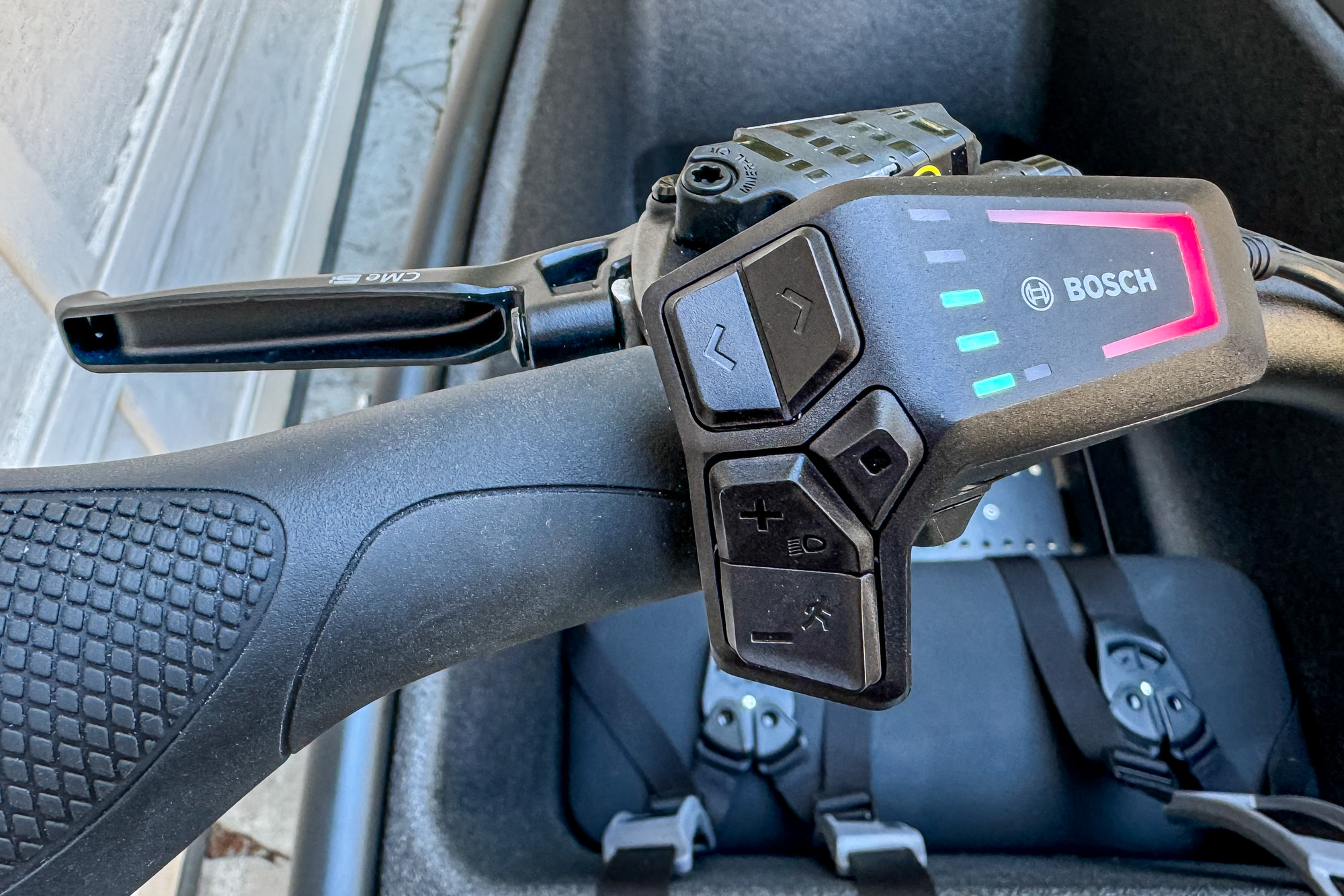 You control the system’s function from a button pod on the left side of the handlebar.