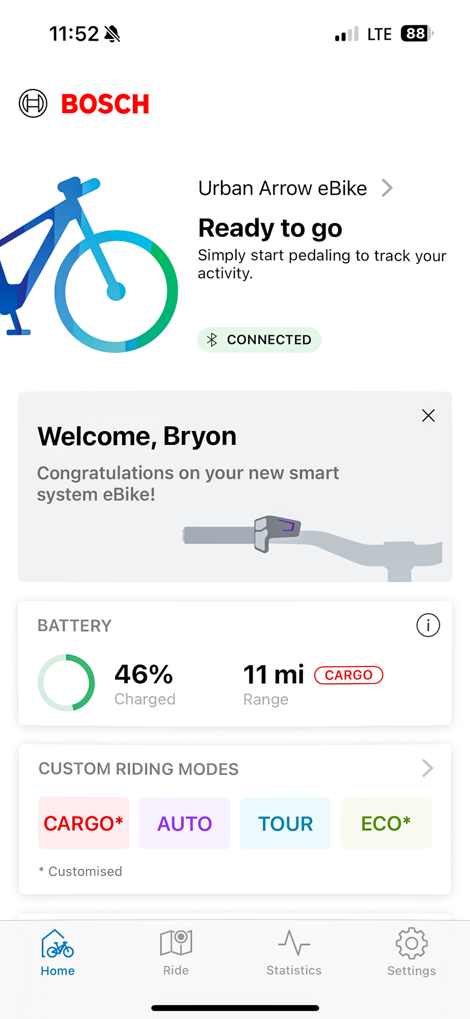 Pro tip: Use the app and set up the Eco ride mode to be the custom settings you want. I set it up with the most assistance across the board. This way, you only have to hit the scroll button once the bike starts up from the off position. It saves you button pushes — and time.