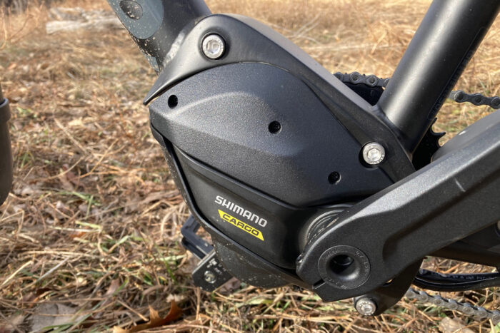 The front and rear brakes are Tektro M745 four-piston hydraulic disc brakes. Like most of the e-bikes we tested, the brakes started out a little loud. But after a few days of riding, they settled in and were quiet. Even with a nearly 300-pound load, the stopping power was excellent on the 1.4-mile descent from our Chautauqua picnic.