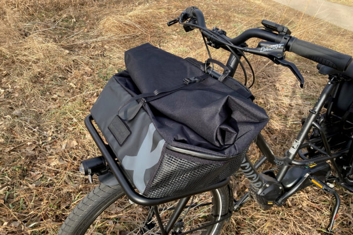 The Xtracycle Swoop 2.0 payload is an impressive 470 pounds and, as I mentioned above, our full load of kids and bags was just shy of 300 pounds. The Swoop can accept front and rear cargo racks. We had the front rack with the large PorterPack with a 19-56L capacity — variable thanks to the magnetic roll-top closure. The PorterPack absorbed three kids’ school backpacks.