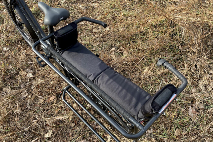 The rear rack is one of the largest we’ve had on a long-tail style cargo bike at 30 inches. With 6- and 9-year-olds, the best configuration for us was a double set of Magic Carpet sit pads bent up in the front and back. This offered padded facing backrests surrounded by the very handy Half Hooptie — an oval railing with one side cut out.