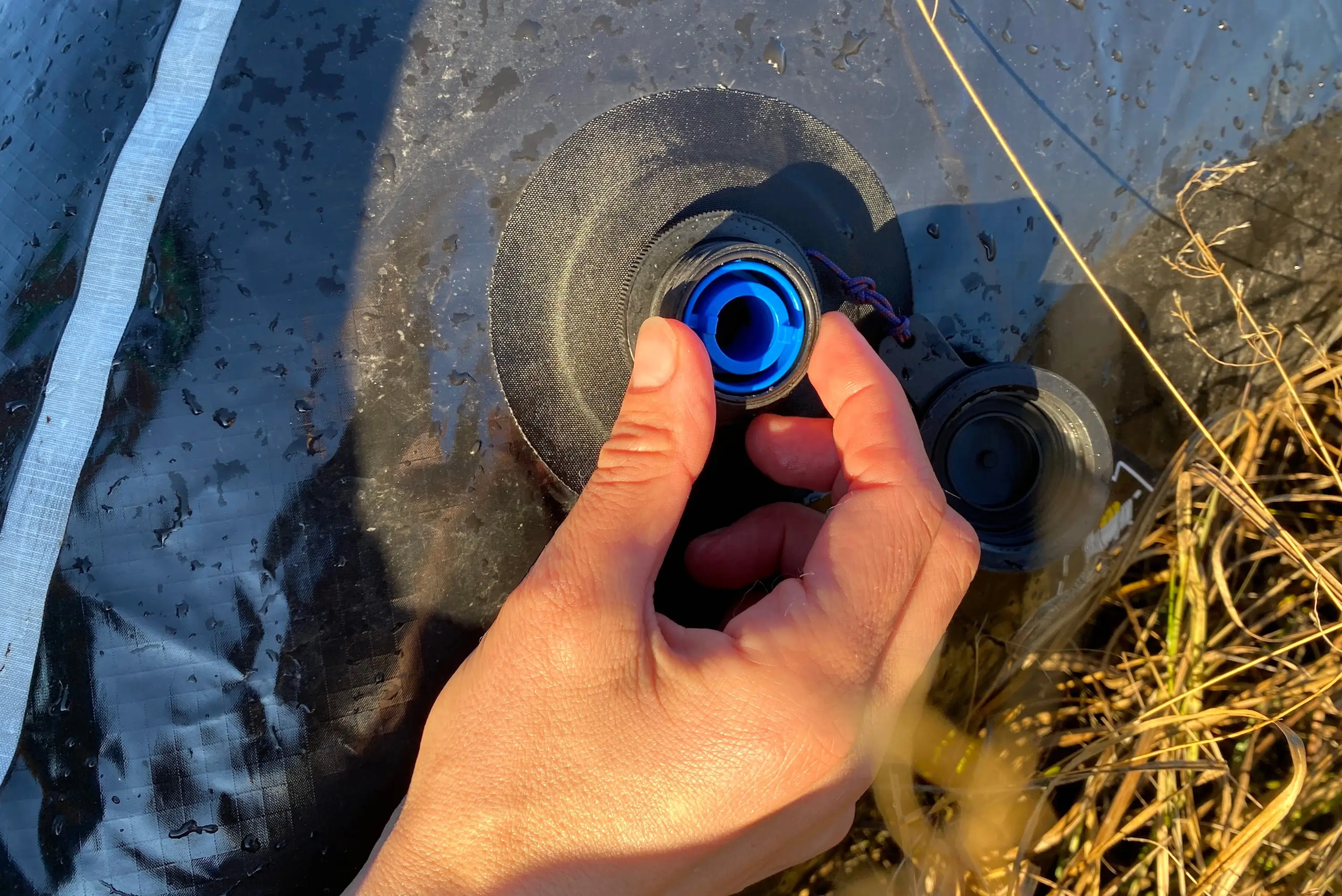 Next, thread the inflation bag onto the valve, and shake out any twists in the bag. To capture air, shake the inflation bag or scoop air and then either bunch the top of the bag in your hand or fold it together to seal the air inside. From there, you can roll the top down or use whatever method you like to push the air into the raft.