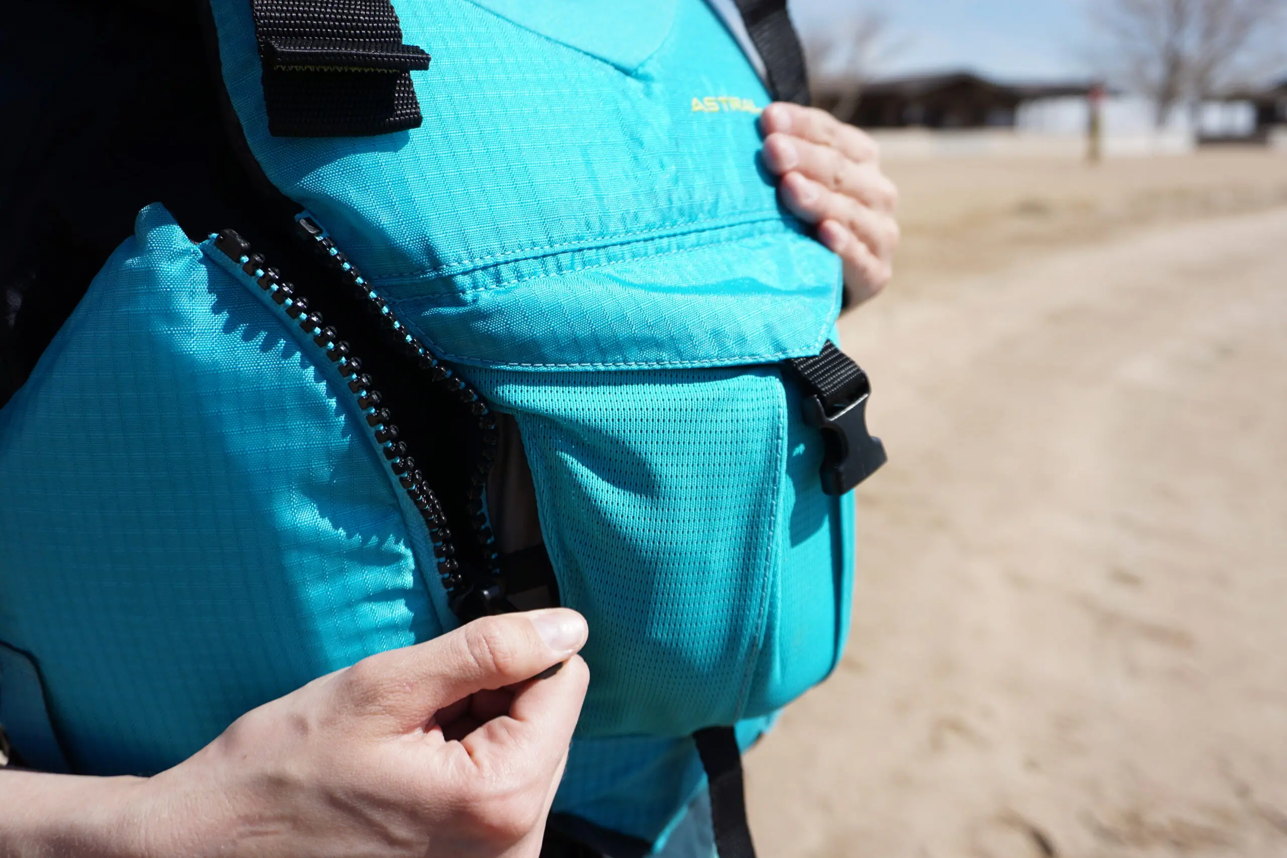 Front chest pockets are by and large the most common, and vests like the Old Town Solitude II and NRS Chinook had some of the most spacious. Simple drop-in zippered pockets with internal organization work for most things, but the clamshell-style pockets of the Astral GreenJacket or NRS Ninja provide a small workspace for fiddling with your kit.
