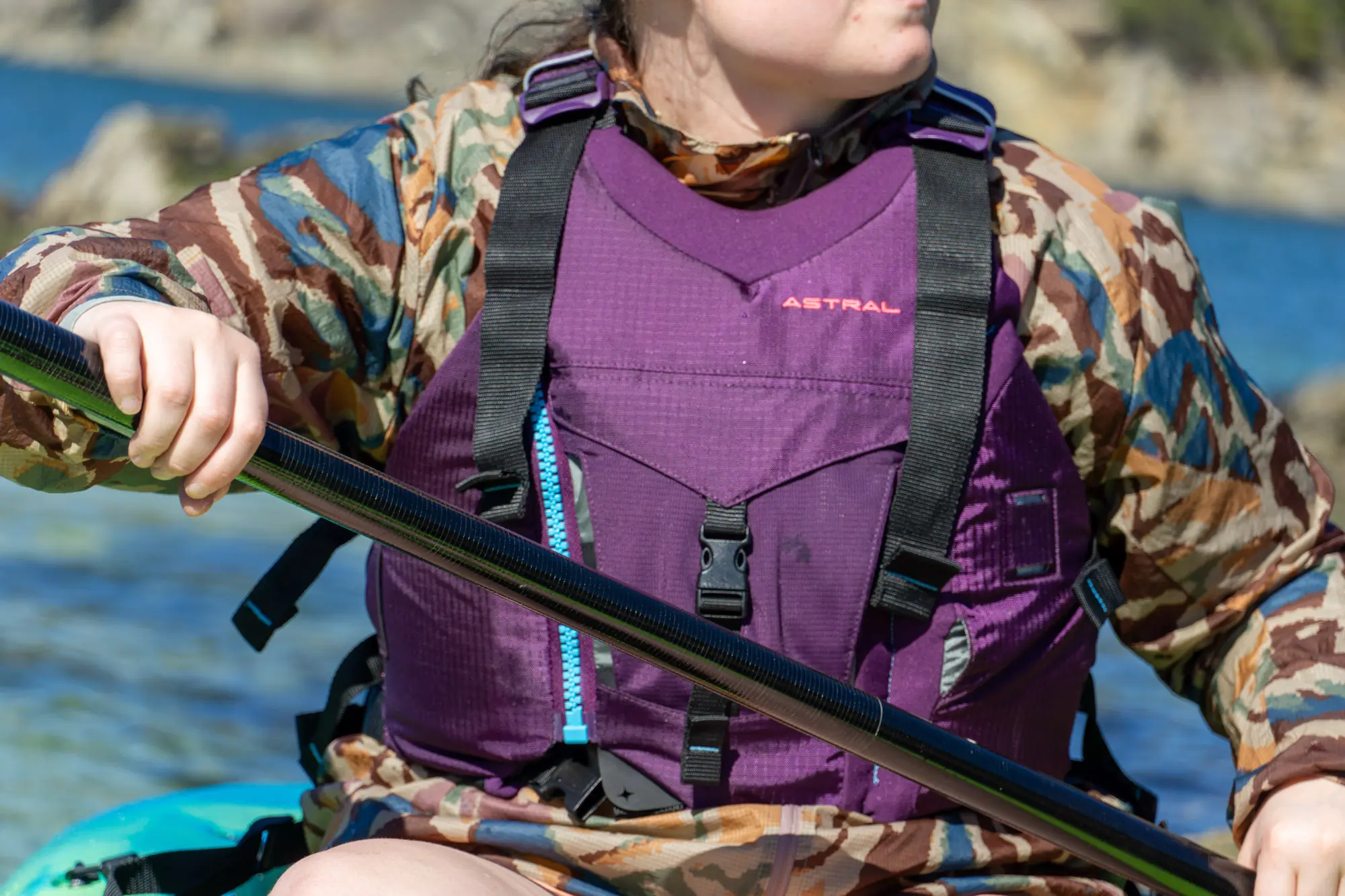 Pullover and side-entry PFDs tend to concentrate foam around the torso compared to the front of the chest, keeping it out of your way while making paddle strokes. Freestyle vests like the NRS Ninja, Astral YTV 2.0, and Astral Layla scored highly in this regard, and were the nicest to paddle all day in.