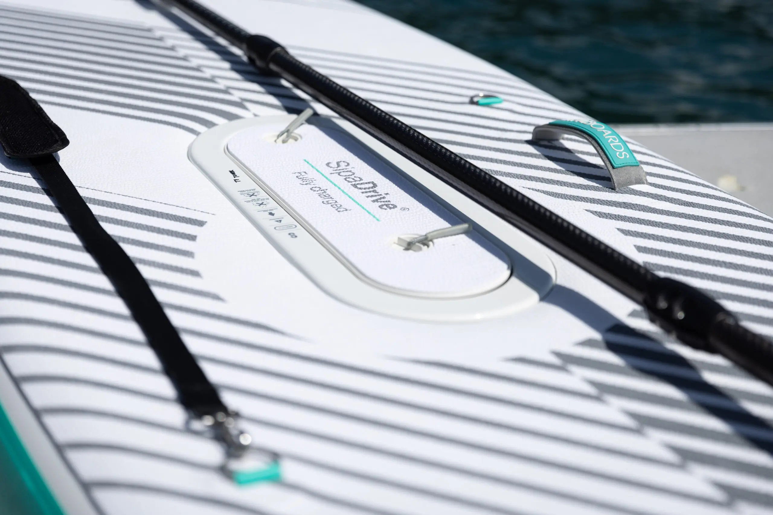 First, the “e” function — battery pack and propeller — is separate from the fin and rest of the board. The unit is self-contained in the center of the board, and if you don’t turn it on, you are still able to paddle the SUP like normal.