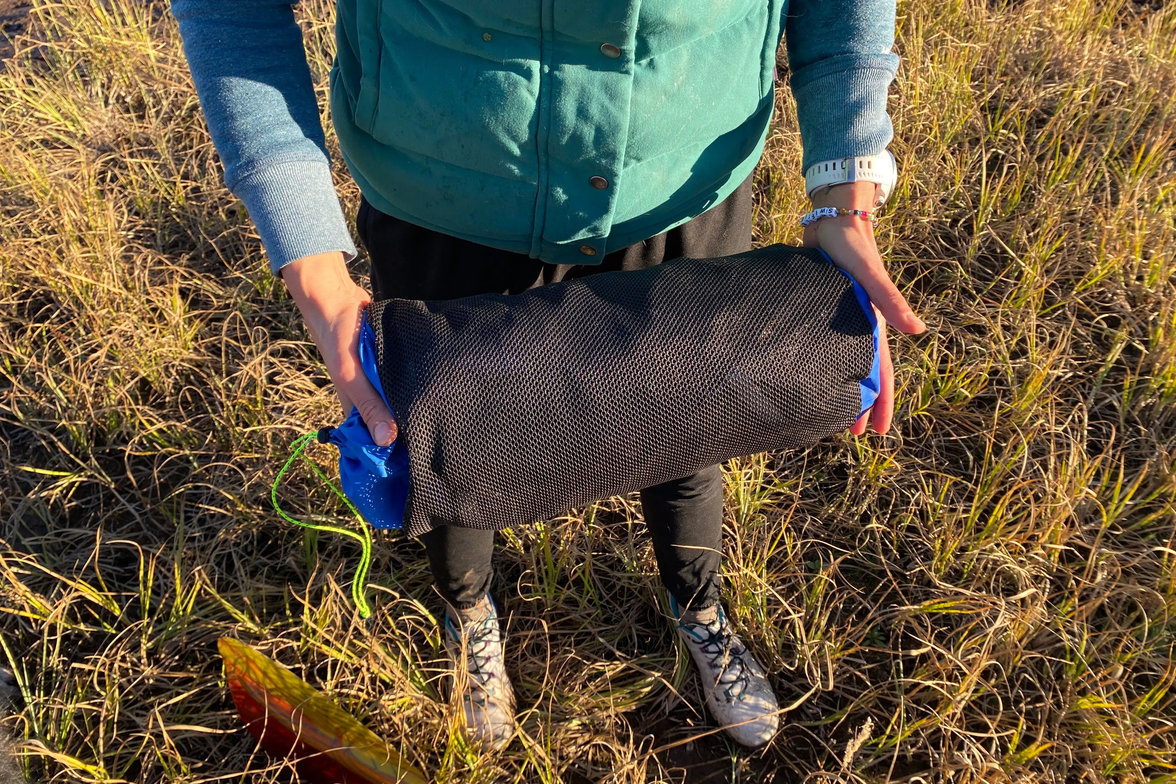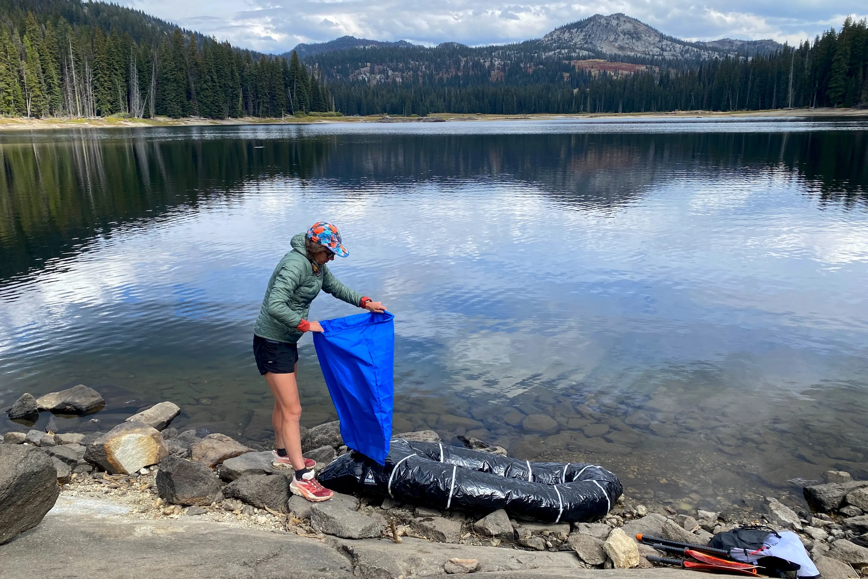 Most modern packrafts eschew the use of a pump and instead use an ultralight inflation bag that looks like a sil-nylon trash can liner. The bag screws onto the boat on one end. Then, you scoop air to fill the bag, twist the top, and push all that air volume into the boat.