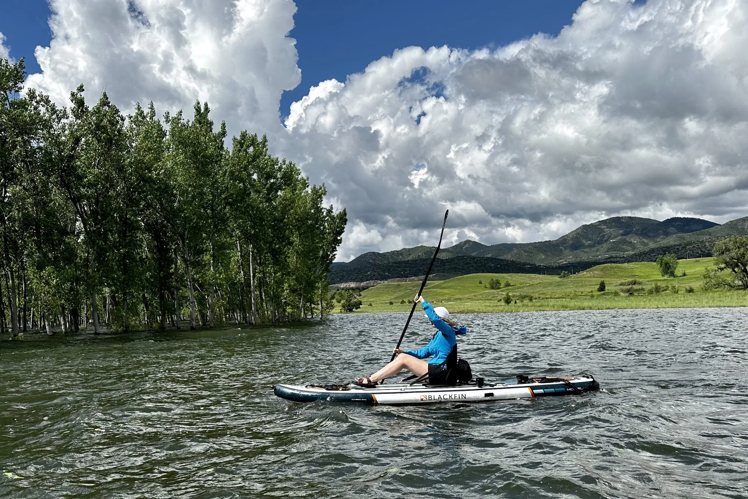 My first test with this paddle was in some tricky weather. For leisure paddling, that’s a bummer, but for gear testing it was great. I paddled about a quarter-mile from shore out and back a few times, in about 20mph crosswinds. Even closer to shore, the waves on Chatfield Reservoir had picked up. After about 10 minutes, I dropped from my race stance to sitting, quickly swapping out my T-grip for the second paddle blade.