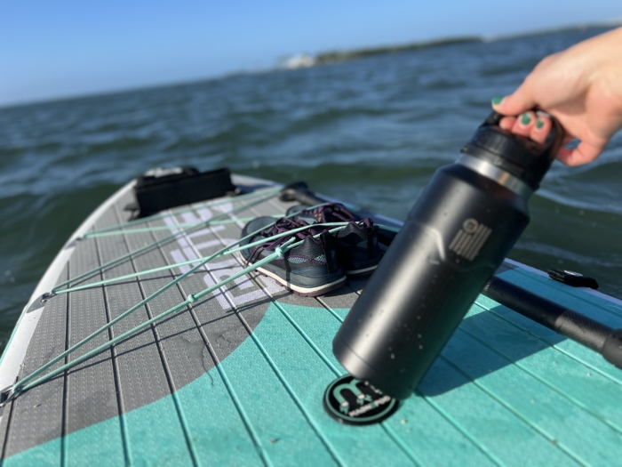 The magnet is super powerful and we had no issue with our bottle flying off while paddling choppy ocean currents. We had to make sure to swing our paddle high enough — so as to not karate chop the bottle — and tried to not splash water into our open canned beverage. But the magnetic system worked great.