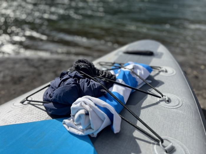 We always carry a soft microfiber towel in the trunk. If we’re hiking in, we carry a lightweight towel and brush the dirt off the board as we roll it up for the hike out.