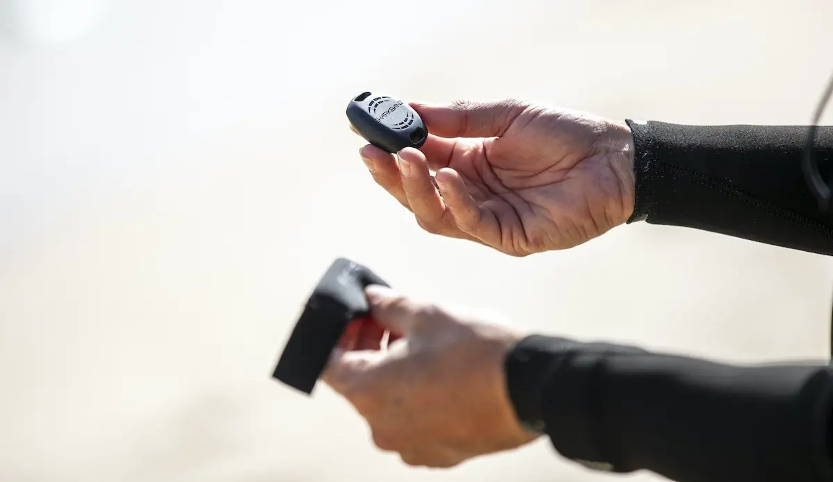 During the developmental phase, FCS and Sharkbanz decided that they needed even more convenience. Despite its diminutive size, they knew some surfers would view it as a distraction to performance, so they decided to include a neoprene sleeve with ends that secure together with Velcro. Surfers can slip the POD into the sleeve and then use the Velcro to attach it around their leash cuff.